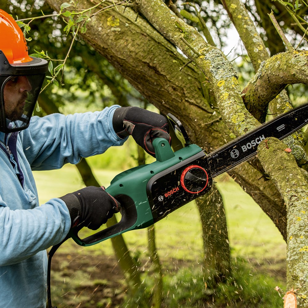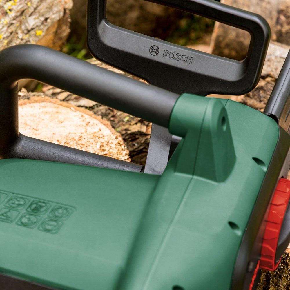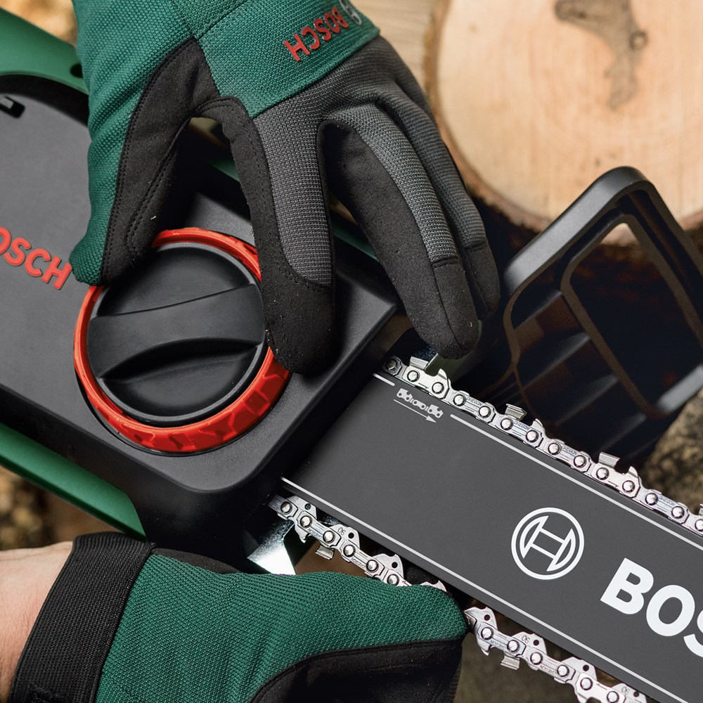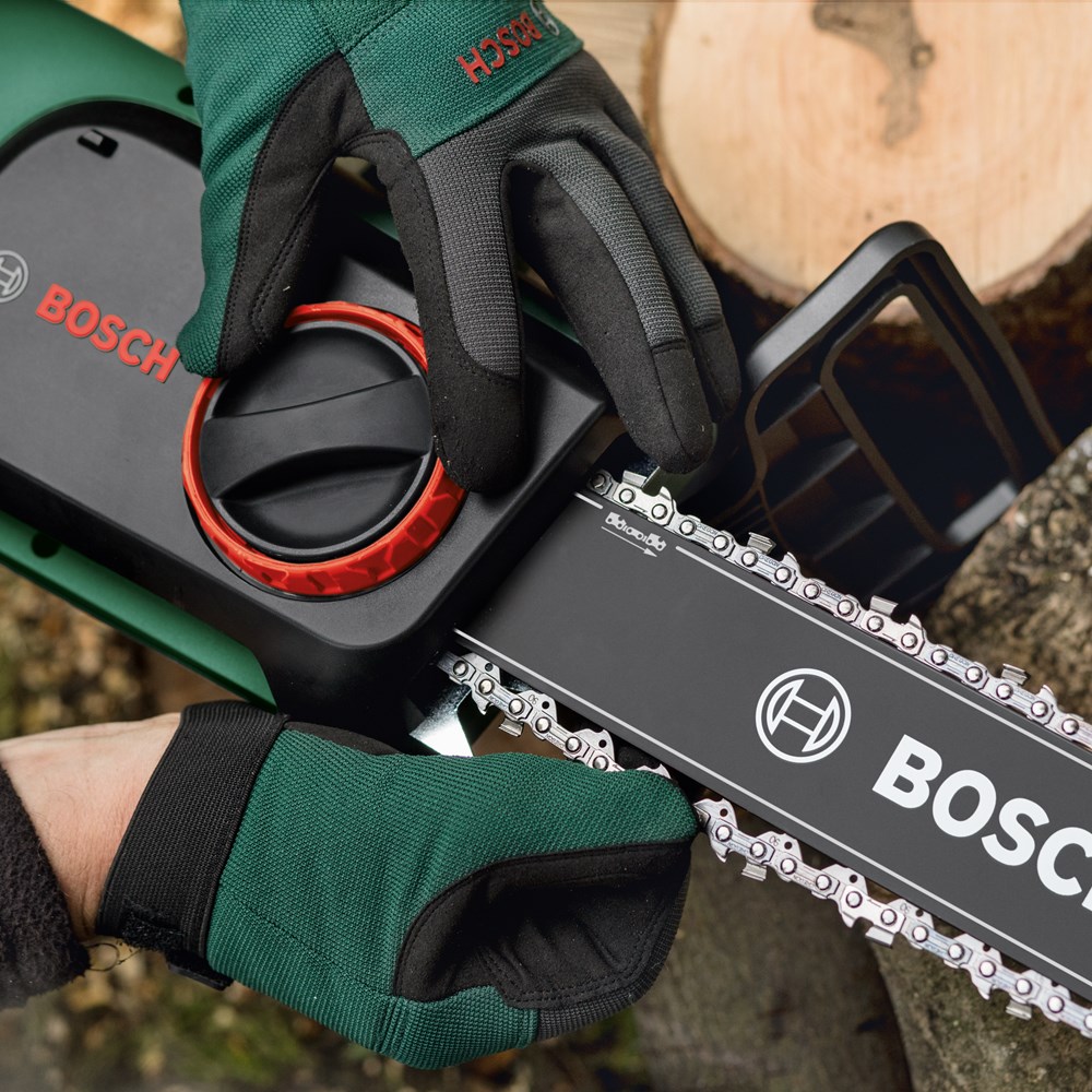 De UniversalChain met snoer, ontworpen voor maximale resultaten met minimale inspanning De kettingzaag UniversalChain met snoer, licht met een gewicht van 4,2 kg en ergonomisch ontworpen voor maximaal gebruikersgemak. Een krachtige motor van 1800 W met een kettingsnelheid van 12 m/s zorgt voor snelle zaagprestaties. Het compacte Bosch SDS-systeem maakt het mogelijk om de ketting zonder extra gereedschap en eenvoudig te spannen en onderhouden. Een groot oliereservoir aan de zijkant met een handige dop met bandje garandeert gemakkelijk bijvullen van het automatische kettingsmeersysteem. Een robuuste terugslagrem garandeert een volledige kettingstop voor veiligheid. Deze kettingzaag is gemakkelijk te gebruiken en wendbaar, zodat hij ideaal is voor het zagen van houtblokken, takken en kleine tot middelgrote bomen.