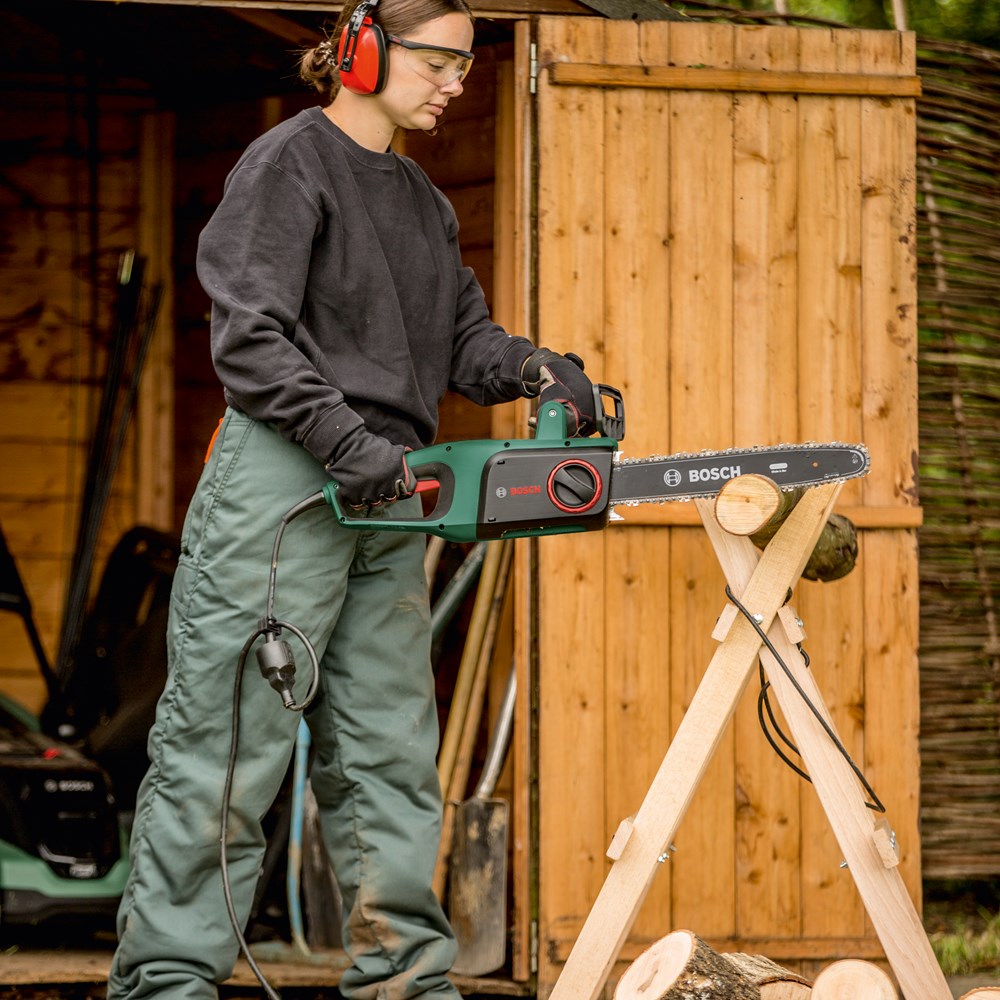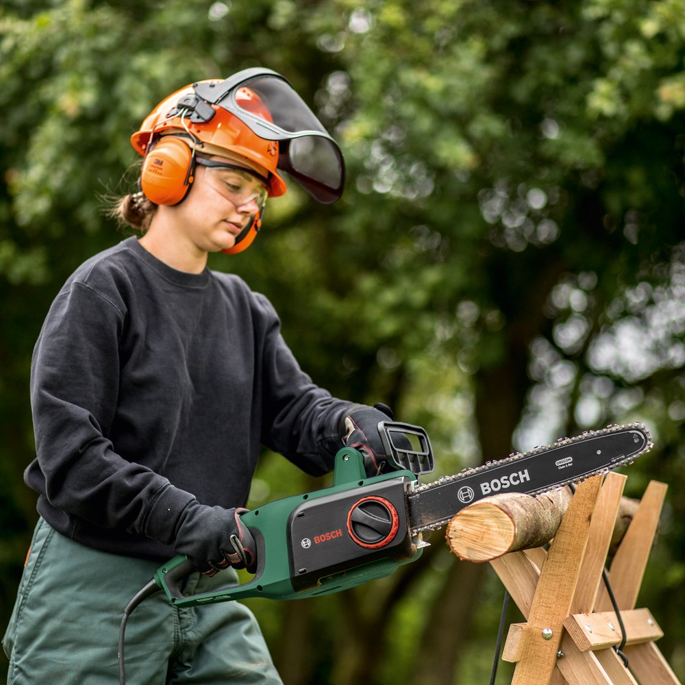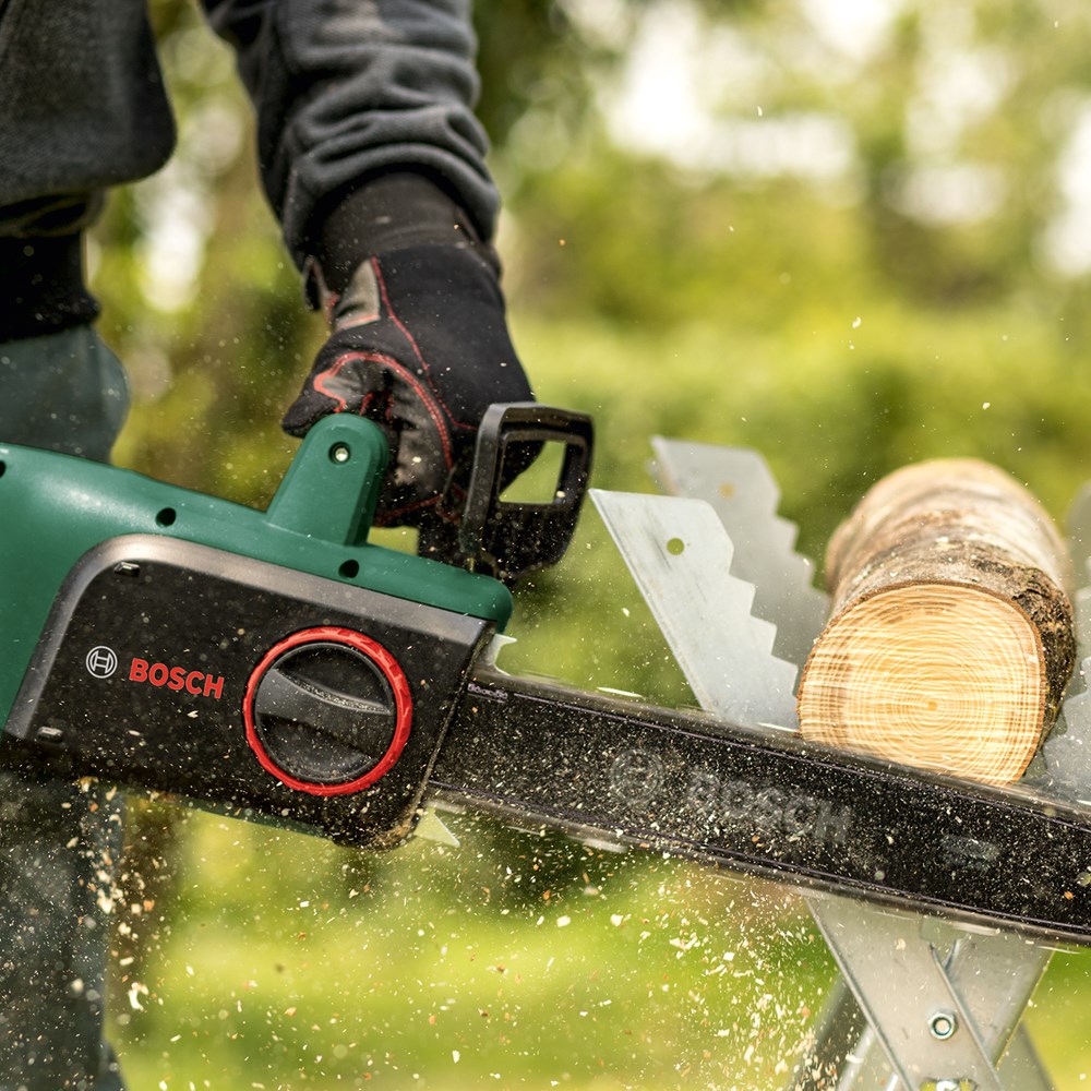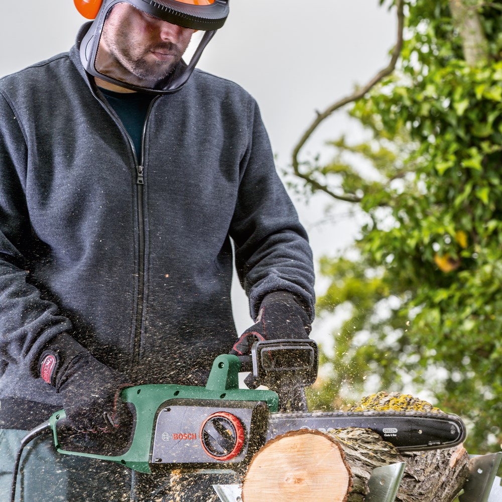De UniversalChain met snoer, ontworpen voor maximale resultaten met minimale inspanning De kettingzaag UniversalChain met snoer, licht met een gewicht van 4,2 kg en ergonomisch ontworpen voor maximaal gebruikersgemak. Een krachtige motor van 1800 W met een kettingsnelheid van 12 m/s zorgt voor snelle zaagprestaties. Het compacte Bosch SDS-systeem maakt het mogelijk om de ketting zonder extra gereedschap en eenvoudig te spannen en onderhouden. Een groot oliereservoir aan de zijkant met een handige dop met bandje garandeert gemakkelijk bijvullen van het automatische kettingsmeersysteem. Een robuuste terugslagrem garandeert een volledige kettingstop voor veiligheid. Deze kettingzaag is gemakkelijk te gebruiken en wendbaar, zodat hij ideaal is voor het zagen van houtblokken, takken en kleine tot middelgrote bomen.