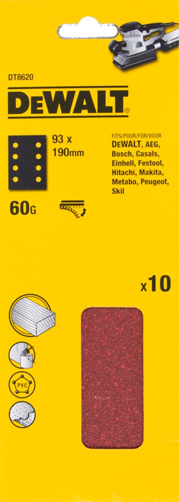 Contacteer onsDeWALT Artikelnummer: DT8620-QZ SCHUURPAPIER 1/3. 93X190MM. VELCRO. 8 GATEN. K60