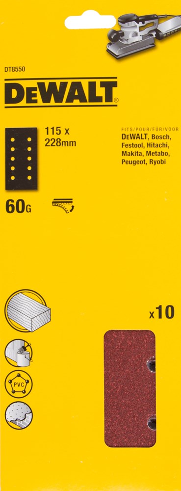 Contacteer onsDeWALT Artikelnummer: DT8550-QZ SCHUURPAPIER 1/2. 115X228MM. VELCRO. 10 GATEN. K60