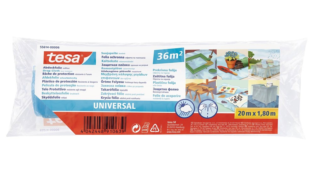 Contacteer onsVan plan om een muur te schilderen of je huis te renoveren? Dan helpt de tesa® Drop Cloth Universal je gegarandeerd om de klus op een professionele manier te klaren zonder dat je het risico loopt dat er vuil of gemorste verf op je tapijt of meubilair terecht komt. Dit plastic afdekfolie is een duurzame oplossing van 4 m x 5 m. Het is zowel scheurvast als bestand tegen glanzende oplosmiddelen, waardoor het een perfect grondzeil is voor de bescherming van grote oppervlakken.