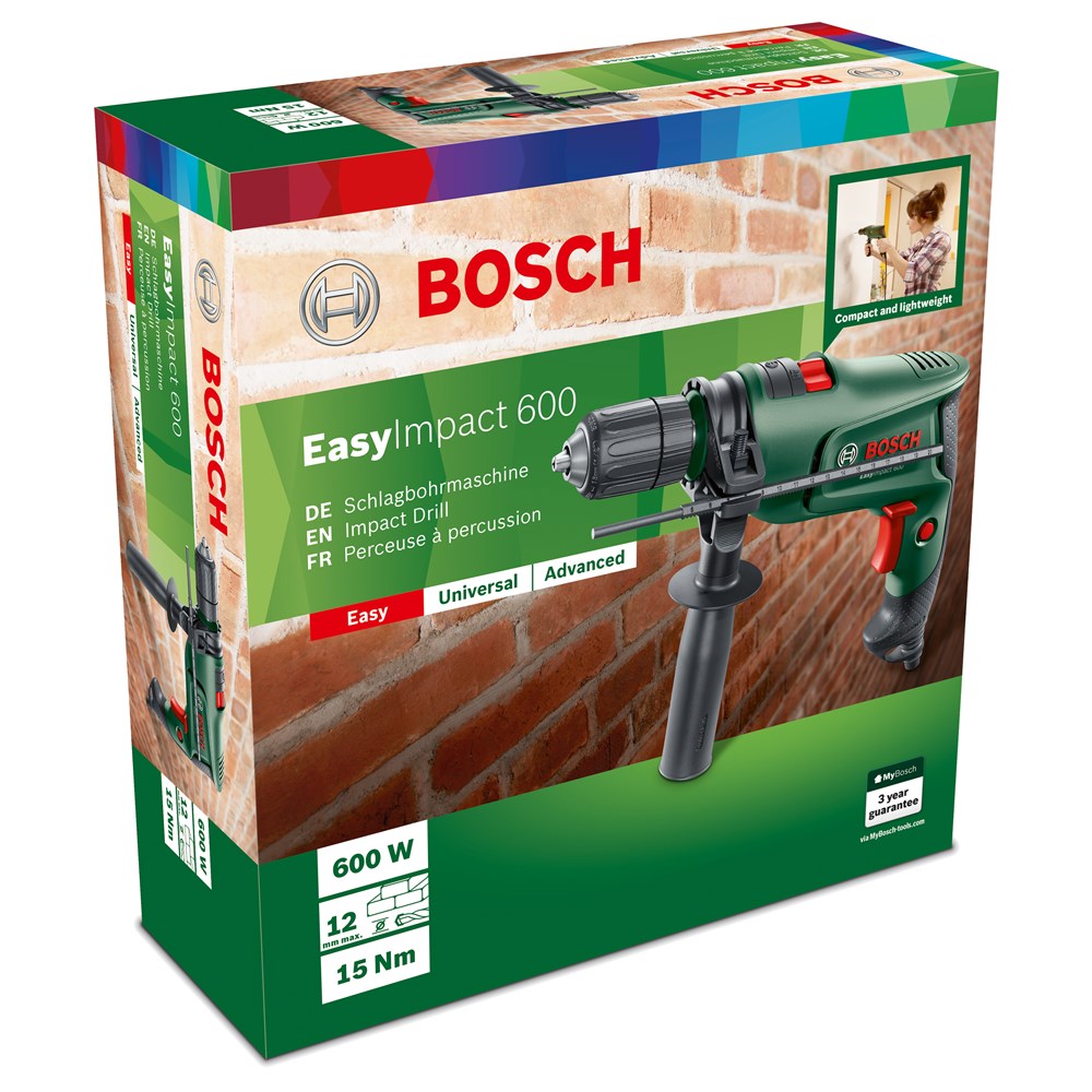Ideaal voor moeiteloos nauwkeurig boren in diverse materialen De EasyImpact 600 maakt comfortabel nauwkeurig boren mogelijk in metselwerk, hout, zacht beton en metaal. Een tweehulzige snelspanboorhouder zorgt voor snel en eenvoudig wisselen van de boor met een eenvoudige draai van de booras. De machine beschikt over elektronische toerentalregeling die het juiste toerental voor het materiaal levert door de drukgevoelige schakelaar. Ergonomisch ontworpen is de machine licht met een gewicht van slechts 1,7 kg en compact voor moeiteloos bovenhands boren. Een motor van 600 W garandeert betrouwbare resultaten in diverse materialen, waarbij boordiameters van maximaal 12 mm in metselwerk en maximaal 25 mm in hout mogelijk zijn.