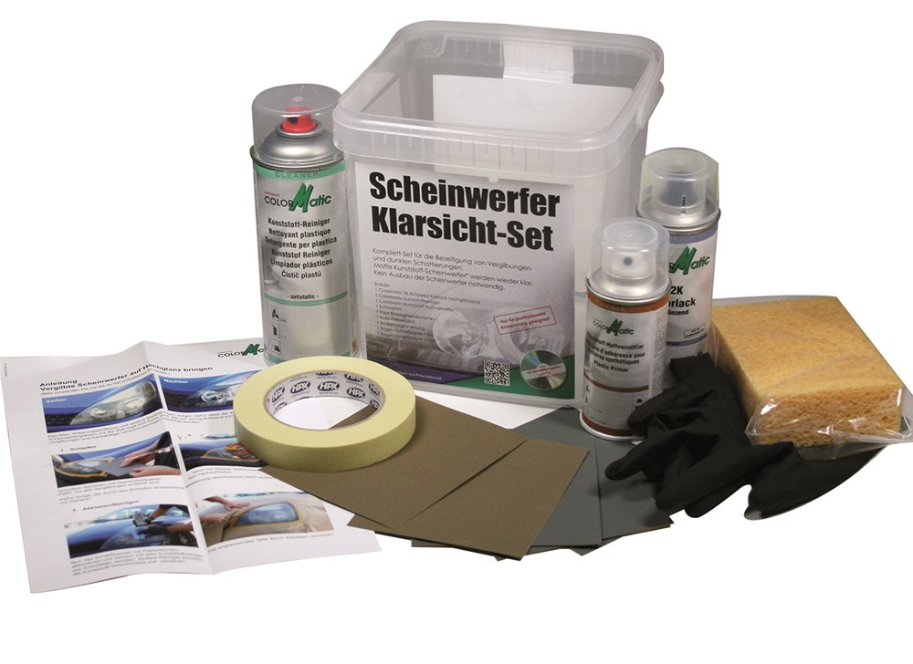 Contacteer onsDe ColorMatic koplamp renovatie set werd speciaal samengesteld voor het herstellen van vergeelde koplampen. Met behulp van de producten in deze set worden matte plastieken koplampen opnieuw helder en dit zonder demontage. Na het opschuren van de matte film wordt het oppervlak opnieuw verzegeld door middel van onze 2K Hi-Speed Clear Coat en biedt het opnieuw een glanzend resultaat met een optimale UV bescherming.