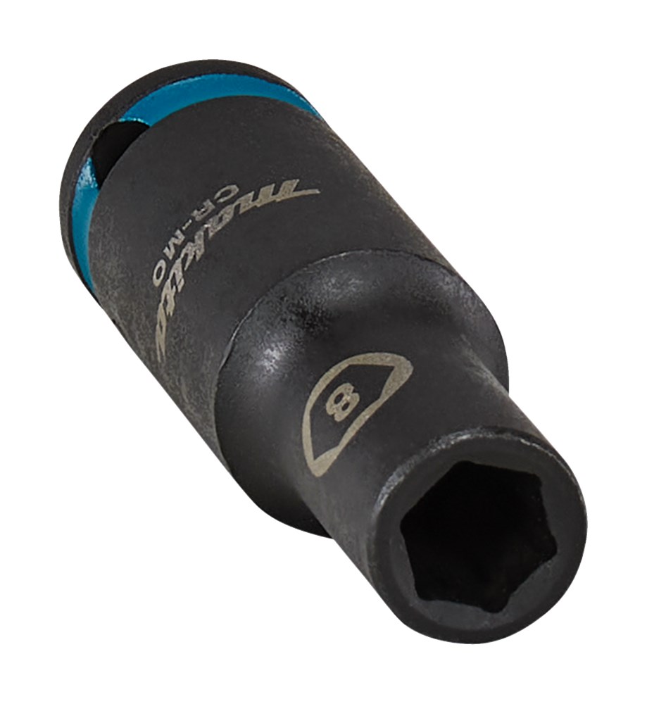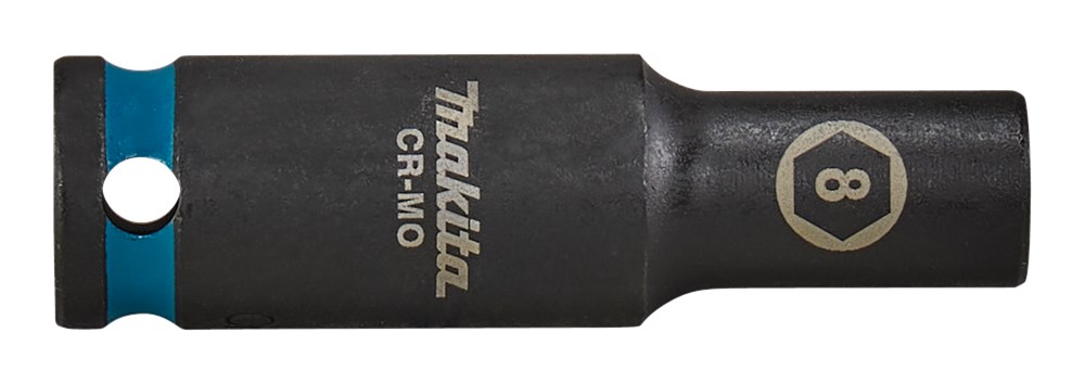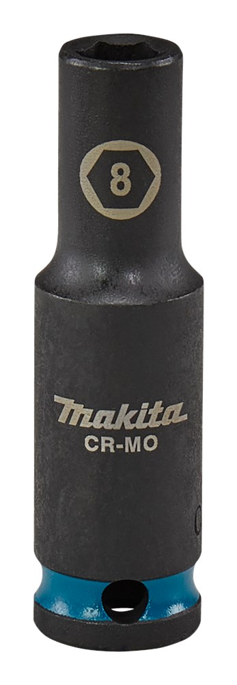 Contacteer onsMakita Chroom-Molybdeem krachtdoppen in verschillende diameters en aansluitingen. Losse borgpennen en O-ringen staan in de categorie Borgpennen en O-ringen krachtdoppen. Extra lange Makita 8mm krachtdop uit de Impact Black serie, met 3/8" VK aansluiting met een werklengte van 63mm; perfect voor lastig bereikbare plaatsen. Deze dop is vervaardigd uit Chroom-Molybdeen, heeft een nauwkeurige passing en een lange levensduur. Voorzien van een Makita-teal gekleurde band en maataanduiding.
