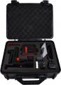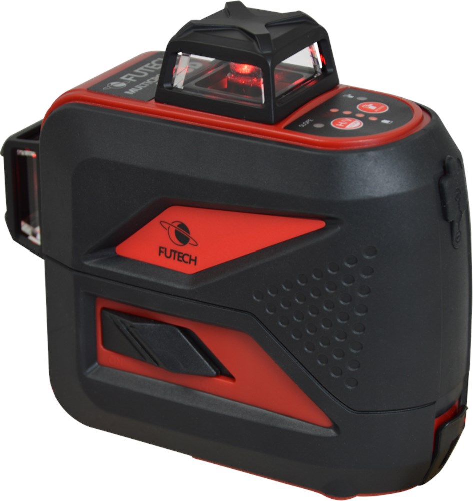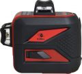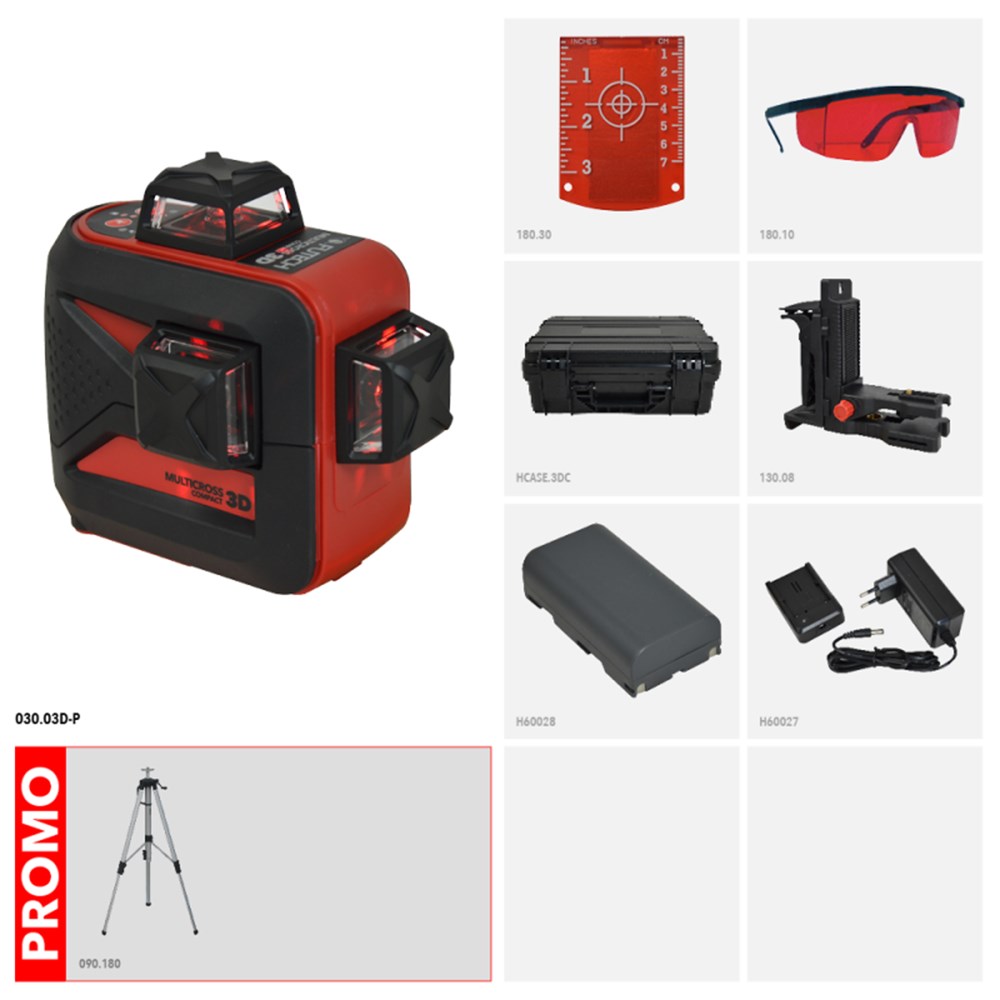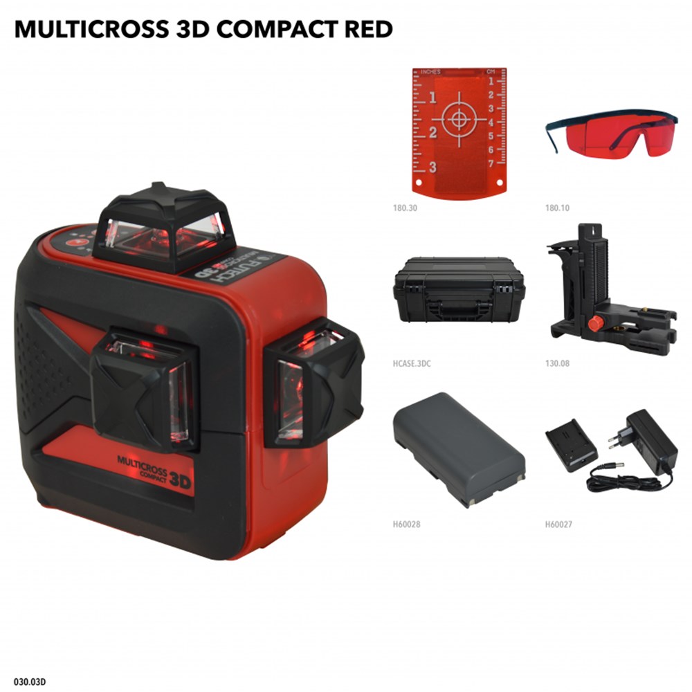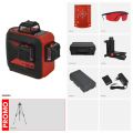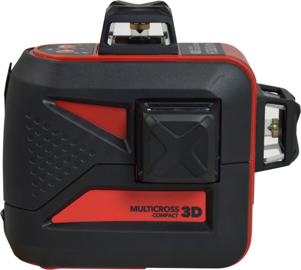 3D Kruislijnlaser met 1 rode horizontale lijn rondom en 2 verticale lijnen rondom (= schietlood boven en onder + 4 hoeken van 90°). Pendelnivellering met 3mm/10m nauwkeurigheid. Geleverd met multifunctionele, magnetische wandhouder. Li-Ion batterij met netstroomadapter/lader.