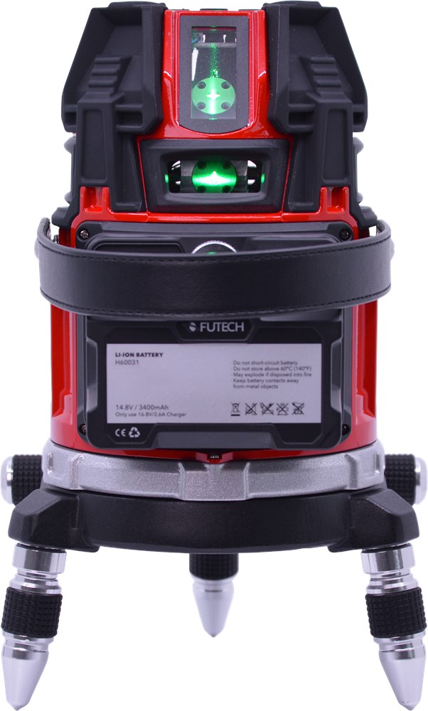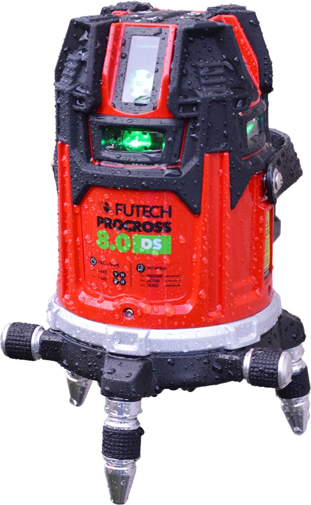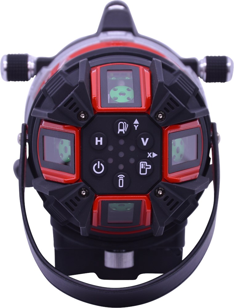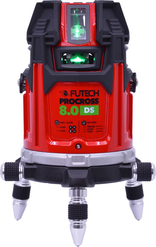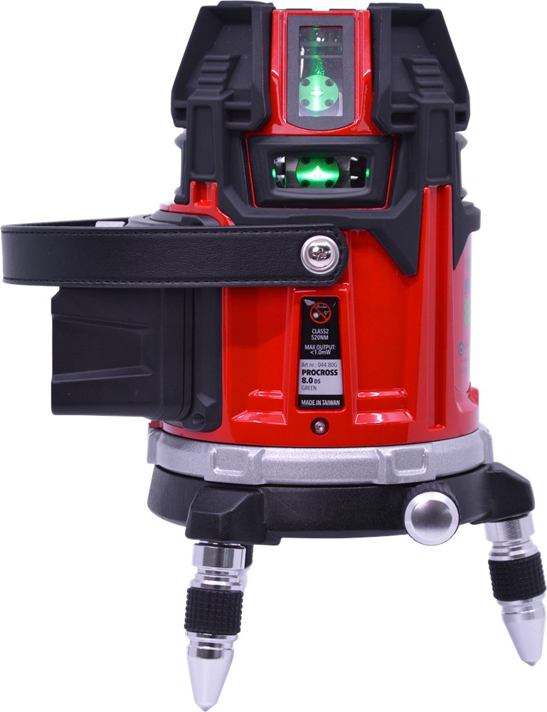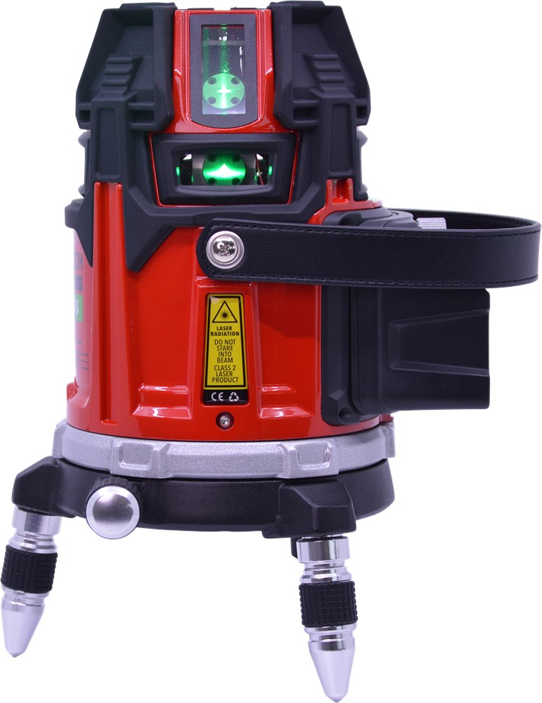4 verticale + 4 horizontale groene laserlijnen van 50mW - Bereik 2 x 200m - Stof-en waterdichtheid IP66 - Nauwkeurigheid 1mm/10m - Dubbele helling, manueel of elektronisch of digitaal (via afstandsbediening) - Tiltfunctie