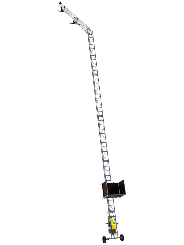 Contacteer onsMultifunctionele ladderlift met verzinkt stalen driehoeks opbouwframes. Voor het transport van allerlei materialen als dakpannen, stenen en isolatie- en dakmaterialen, maar ook zonnepanelen of andere grote en zware produkten. Frames hebben slechts 1 vergrendelpunt daardoor zeer snel en eenvoudig op te bouwen. Het lierwerk is door de meegeleverde wielset makkelijk als een soort van kruiwagen te verplaatsen. Uit te bouwen tot 20 meter hoogte. Maximale belasting: 150 kg netto