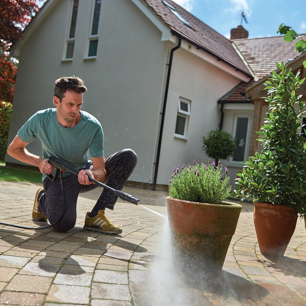 Spoelt, wast, reinigt: 3-in-1-lans pakt hardnekkig en licht vuil aan De Trio-lans is de praktische oplossing voor het verwijderen van verschillende soorten vuil dankzij de drie individuele spuitpatronen: vlakke straal, roterende straal en puntstraal. Instellingen kunnen eenvoudig worden gekozen door handige pictogrammen op de lans. Met een eenvoudige draai kunnen diverse klussen flexibel en snel worden aangepakt. De brede roterende straal is ideaal voor het reinigen van terrassen of opritten. Hardnekkig vuil, zoals vlekken op stenen, kunnen worden aangepakt met de puntstraal.