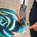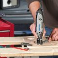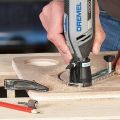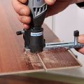 Bevestig het meegeleverde multifunctionele freesmes (561) en schroef het lijn- en cirkelfreeshulpstuk op je Dremel multigereedschap. Stel de diameter met behulp van de markeringen op het hulpstuk in, boor een gat in het midden van de cirkel die je wilt uitsnijden. Laat het accessoire langzaam in het materiaal vallen en begin de perfecte cirkel te snijden. Gebruik de rechte snijgeleider om in een rechte lijn te frezen of te snijden.