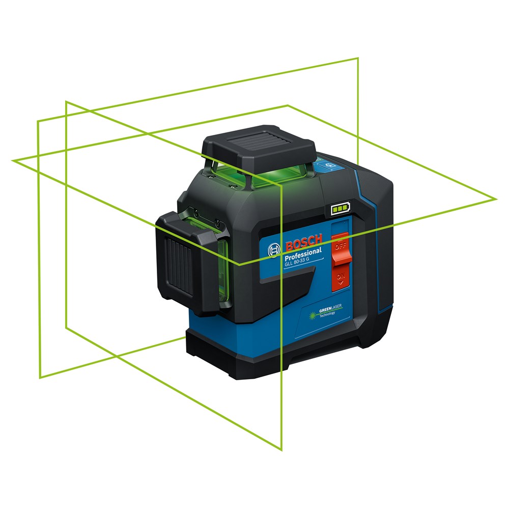 De GLL 80-33 G Professional is een intuïtieve lijnlaser voor de nauwkeurigste uitlijnings- en nivelleerklussen. Door zijn IP65-beschermingsklasse en met rubber versterkte behuizing en laservensters is hij bestand tegen stof en water, voor werken met vertrouwen, zelfs in de ruigste werkomgeving. Het nieuwe toetspaneelontwerp maakt eenvoudige selectie van elke laserlijn mogelijk en heeft een energiebesparingsmodus voor een langere gebruiksduur van de accu. Daarnaast biedt een dubbele voedingsbron (dual power) de flexibiliteit om te wisselen tussen de Li-Ion accu BA 3.7V 3.0Ah XL en AA-alkalinebatterijen, dus geen zorgen over uitvaltijd door een lege accu.