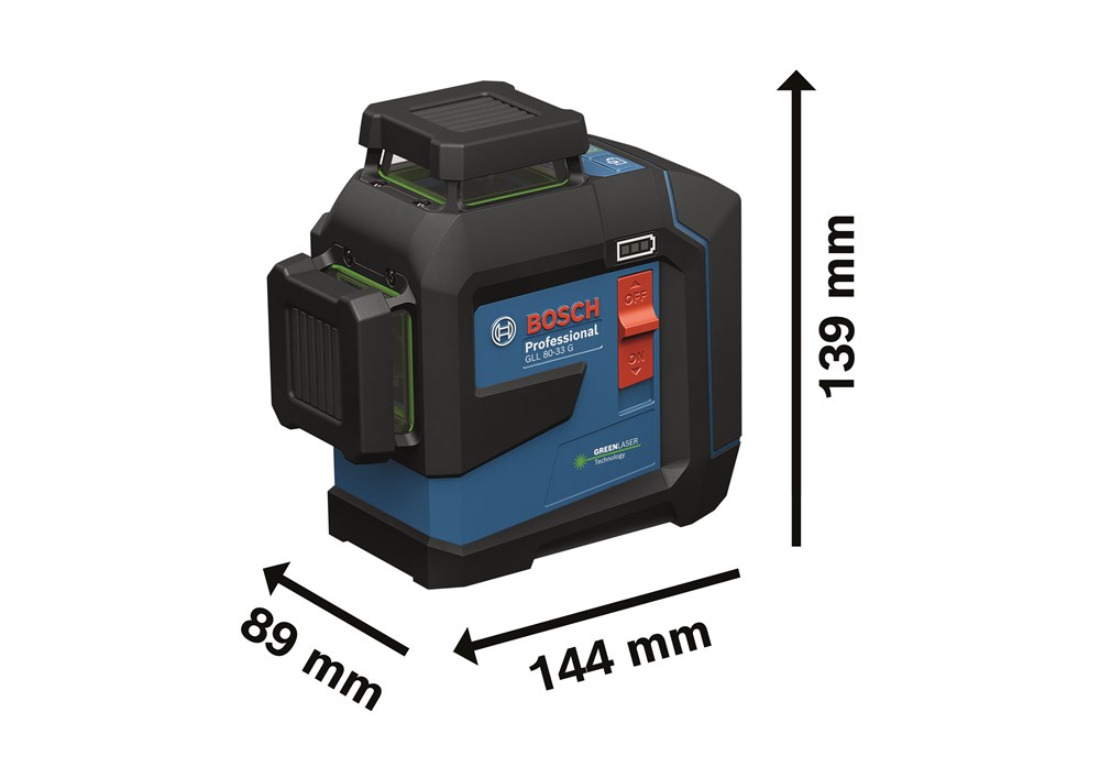 De BA 3.7V 3.0Ah XL kan worden opgeladen tijdens gebruik en garandeert daarmee naadloos werken zonder onderbrekingen. De GLL 80-33 G is ideaal voor uiteenlopende toepassingen, waaronder het plaatsen van gipswanden, het uitlijnen van raamkozijnen en het installeren van verlaagde plafonds. De grote batterij/accu-aanduiding maakt het eenvoudig om de batterijtoestand in de gaten te houden en de 3 x 360° laserlijnen maken het mogelijk om tegelijkertijd horizontaal en verticaal te nivelleren; dat bespaart tijd en moeite.