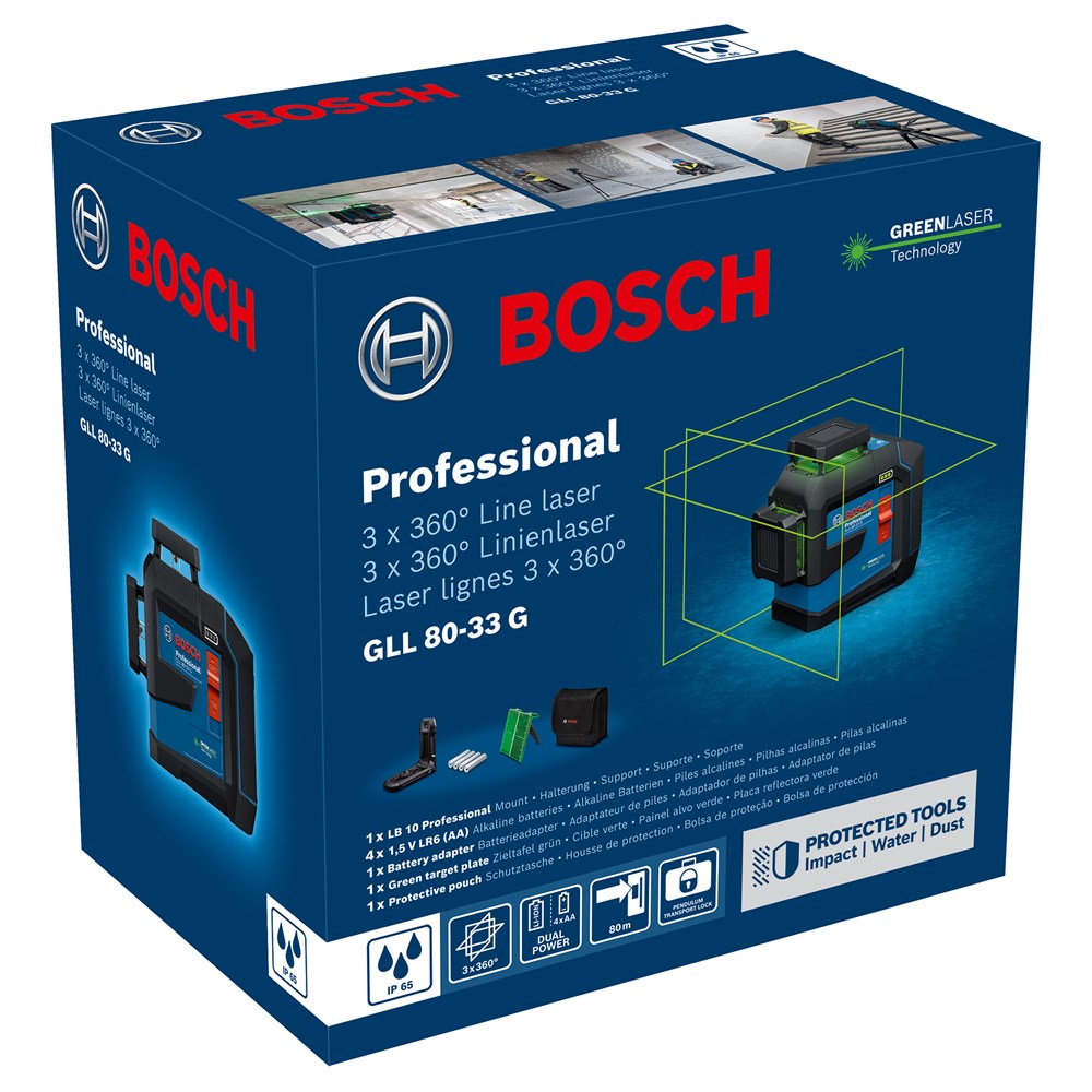 De GLL 80-33 G Professional is een intuïtieve lijnlaser voor de nauwkeurigste uitlijnings- en nivelleerklussen. Door zijn IP65-beschermingsklasse en met rubber versterkte behuizing en laservensters is hij bestand tegen stof en water, voor werken met vertrouwen, zelfs in de ruigste werkomgeving. Het nieuwe toetspaneelontwerp maakt eenvoudige selectie van elke laserlijn mogelijk en heeft een energiebesparingsmodus voor een langere gebruiksduur van de accu. Daarnaast biedt een dubbele voedingsbron (dual power) de flexibiliteit om te wisselen tussen de Li-Ion accu BA 3.7V 3.0Ah XL en AA-alkalinebatterijen, dus geen zorgen over uitvaltijd door een lege accu.