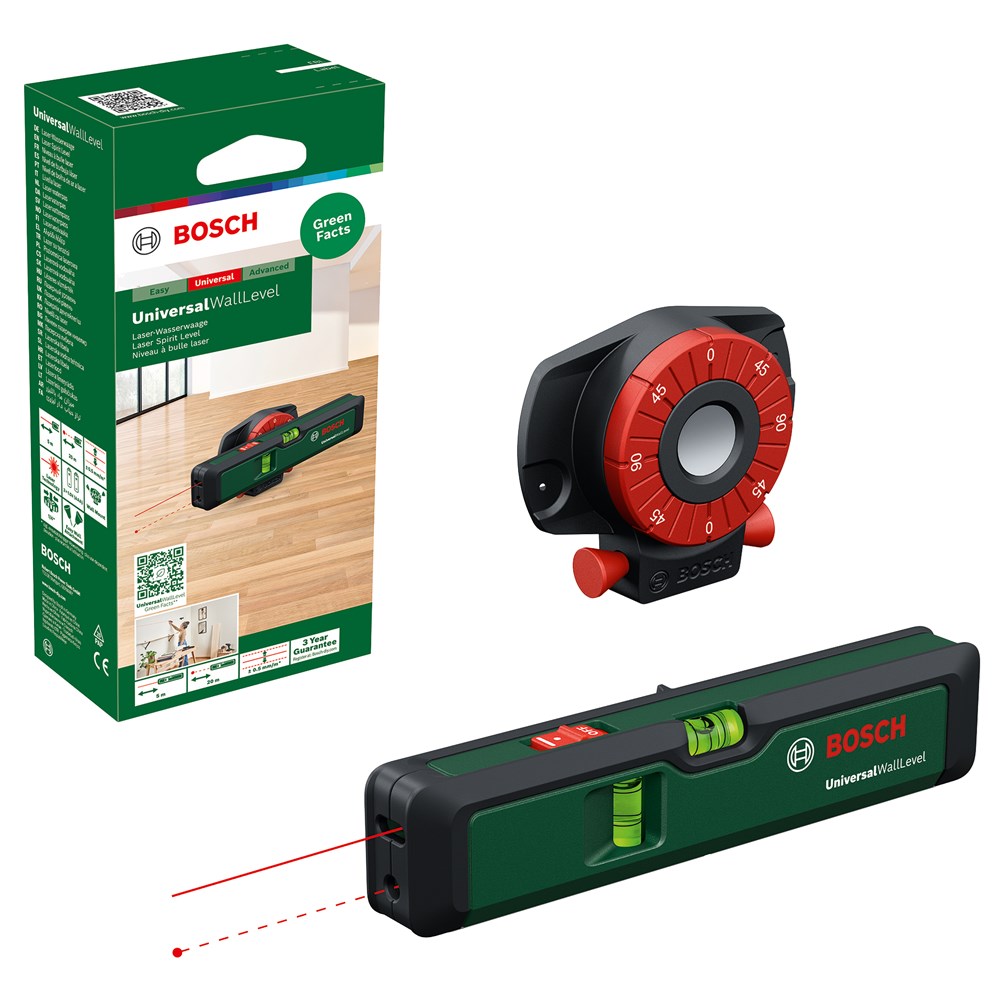 De handige UniversalWallLevel laser-waterpas in zakformaat combineert de functionaliteit van een waterpas, punt en lijnlaser. Het apparaat heeft een nauwkeurigheid van ± 0,5 mm/m en projecteert horizontale, verticale of diagonale laserlijnen of punten, waardoor het perfect is voor allerlei klusjes. Dit handige gereedschap is perfect voor het monteren van gordijnrails, het uitlijnen van kasten, het aanbrengen van boekenplanken en het ophangen van schilderijen, en als het wordt gebruikt als puntlaser , voor het overbrengen van exacte hoogten rondom ruimten voor het monteren van lichtschakelaars en stopcontacten. Dankzij de flexibele wandhouder met pinnen en de magneten op het apparaat kan de UniversalWallLevel veilig en gemakkelijk worden bevestigd op elk oppervlak .