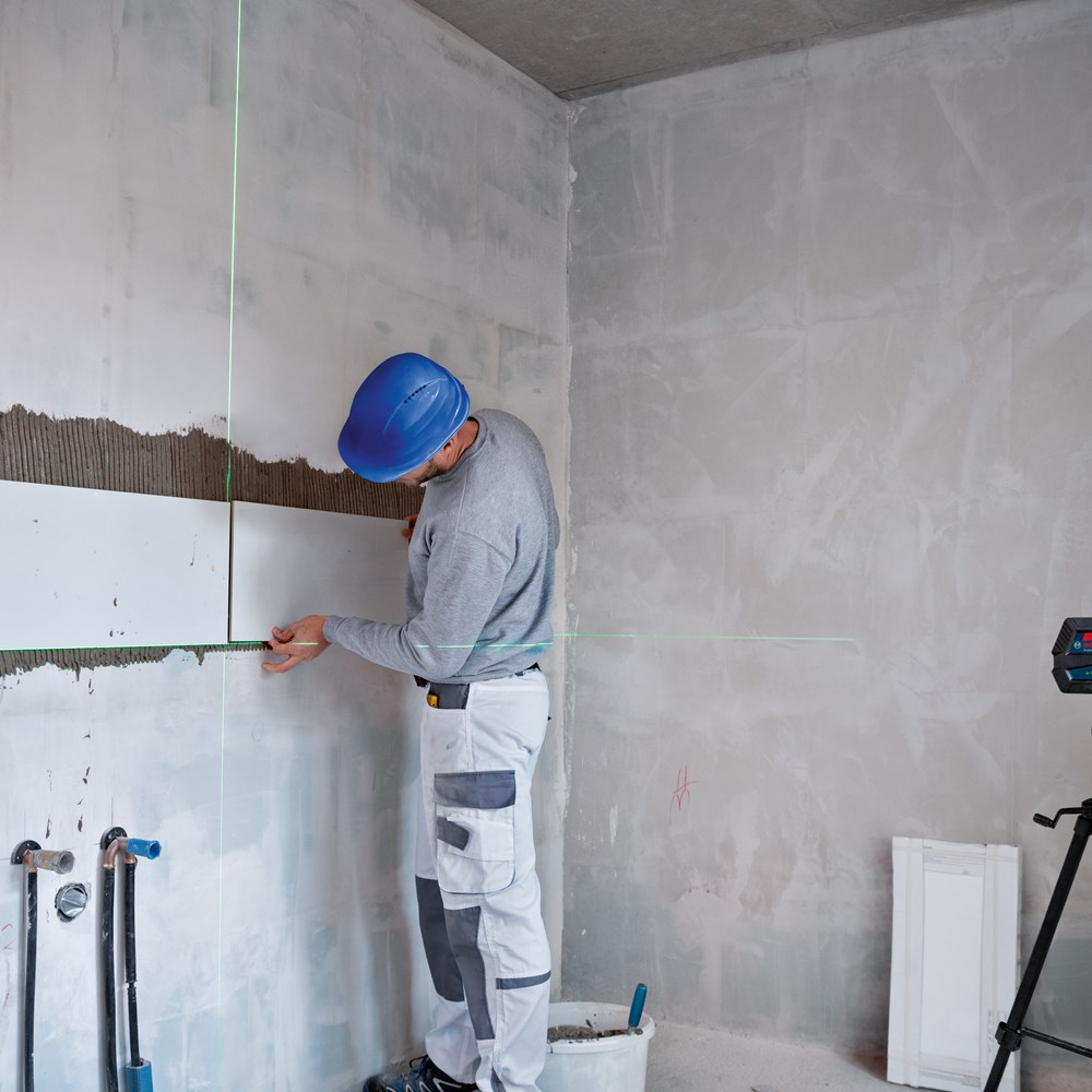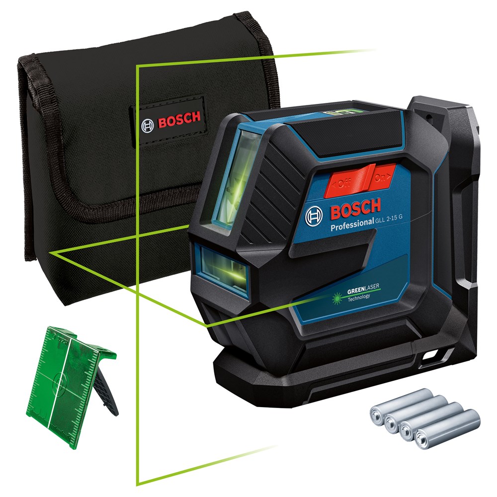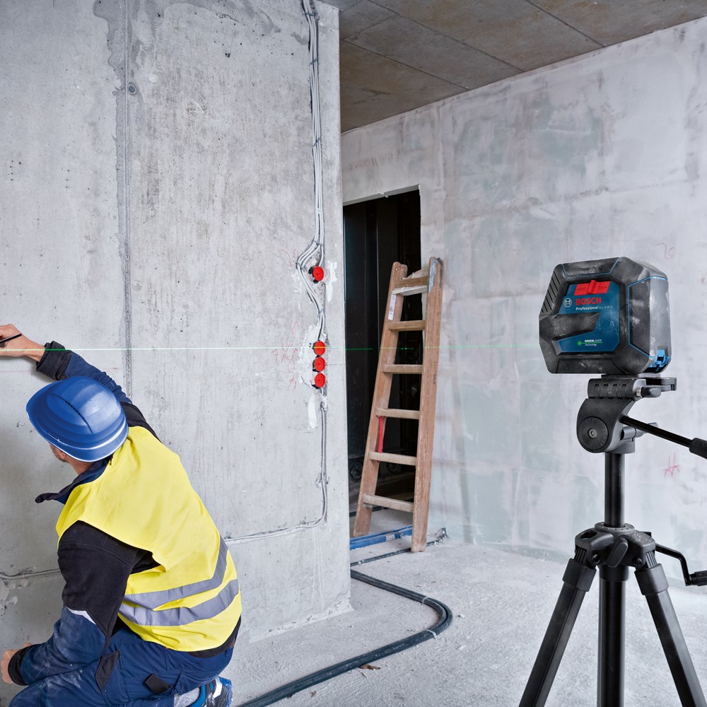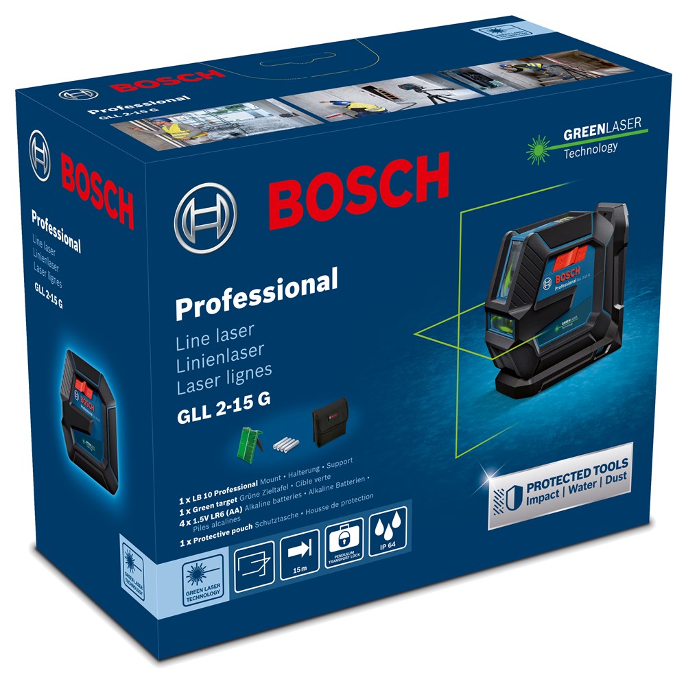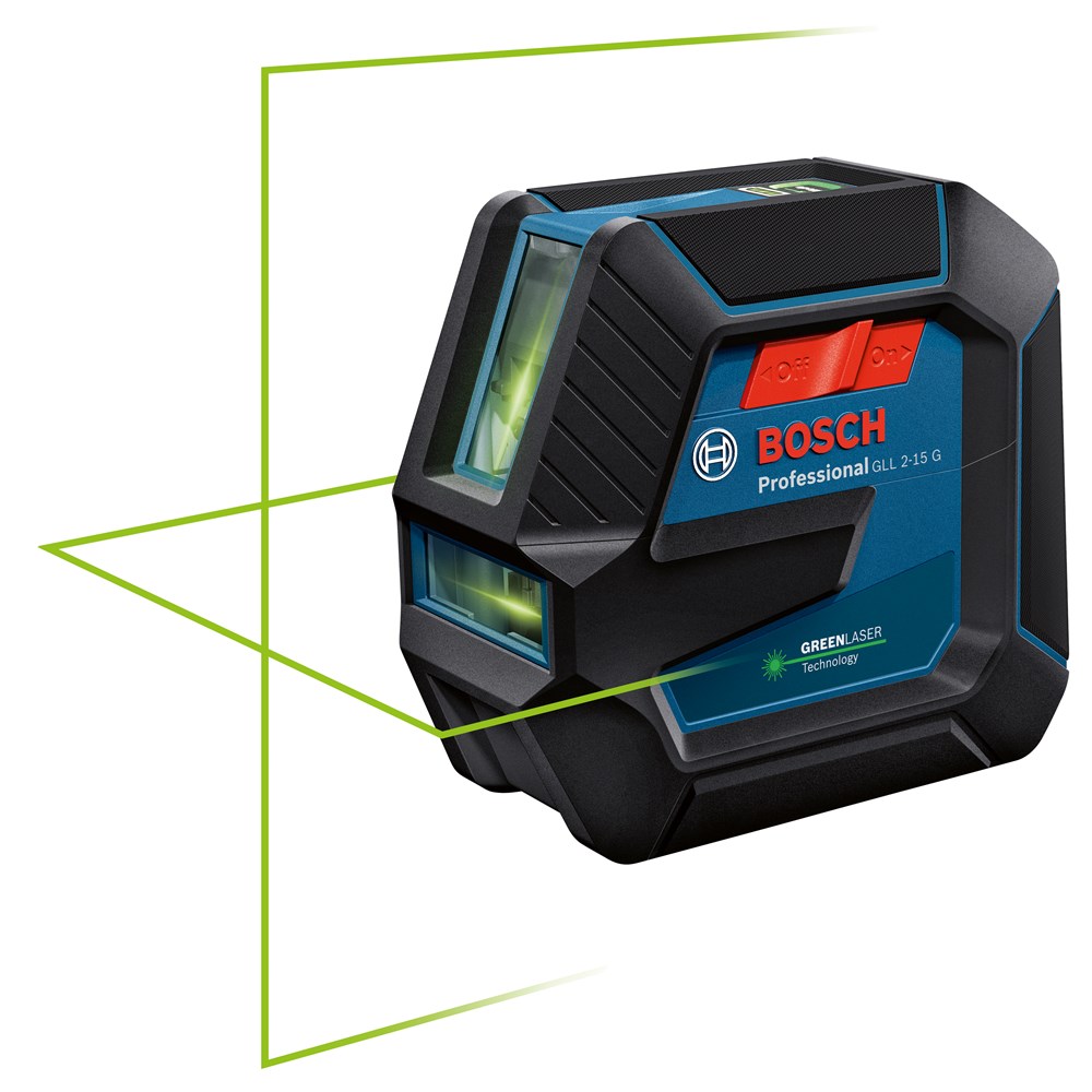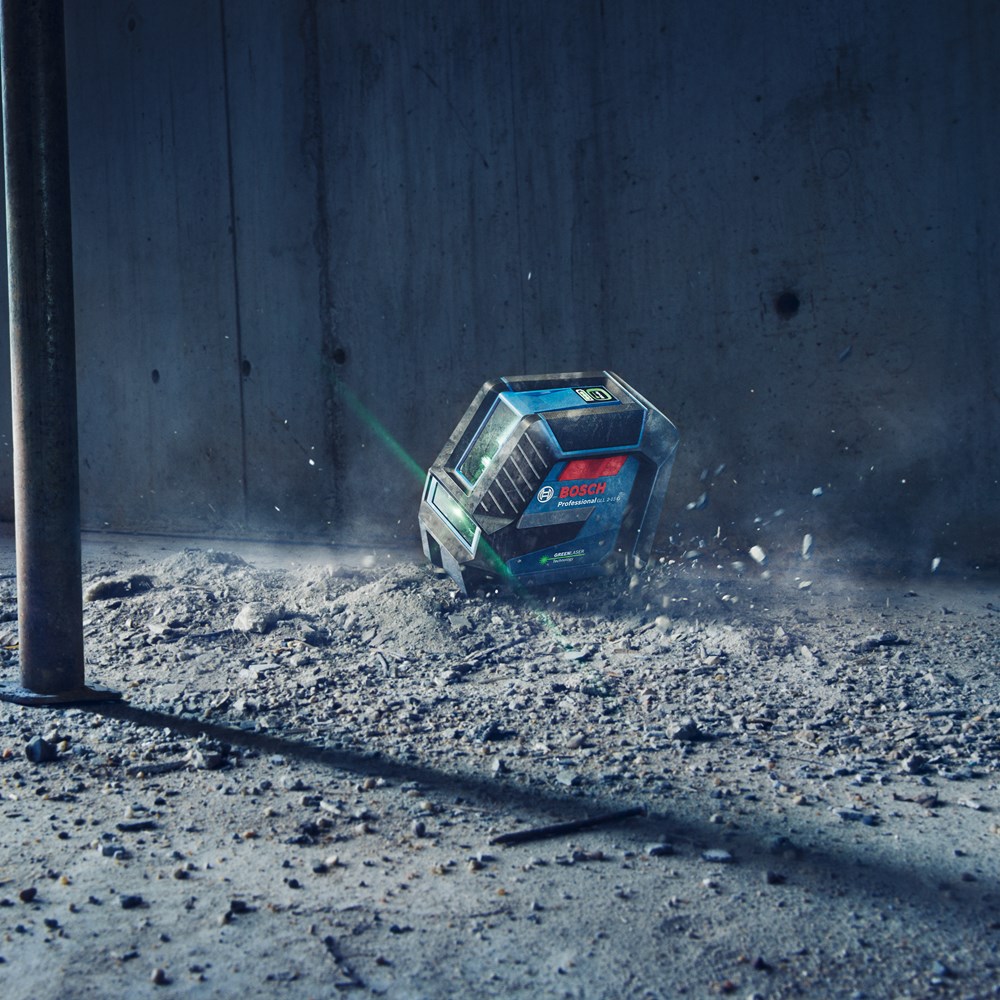 De lijnlaser GLL 2-15 G Professional, die klaar is voor de bouwplaats, is de eenvoudige manier om nauwkeurige resultaten te verkrijgen. Blijf gefocust op de klus dankzij het duurzame ontwerp met een met rubber beklede behuizing voor een betere bescherming van het verzonken glas en een stof- en spatwaterbescherming van klasse IP 64. De uitvoering met AAN/UIT-schakelaar en één toets zorgt voor veel gebruiksgemak. Verticale en horizontale groene laserlijnen zorgen voor een betere zichtbaarheid in omgevingen met fel licht.
