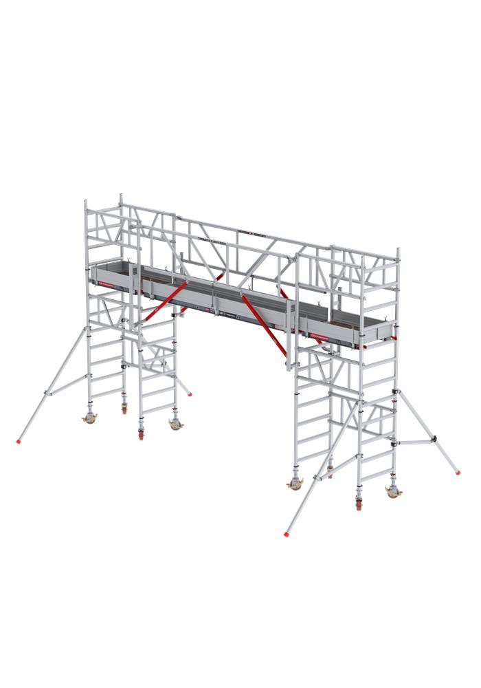 MiTOWER CONNECT. Maak een werkbrug tussen MiTOWER (PLUS) rolsteigers.Met de MiTOWER CONNECT uitbreidingsset maak je eenvoudig een werkbrug op 4,2 of 6,2 meter werkhoogte tussen twee MiTOWER (PLUS) rolsteigers. Volledig op te bouwen door één persoon. De MiTOWER CONNECT bestaat uit speciale leuningstaanders (301227). Voor de werkbrug op 6,2 meter werkhoogte worden hier ook gekoppelde buizen (301228) en doorloopframes (301207) bijgeleverd. In combinatie met standaard onderdelen van RS TOWER 5 rolsteigers (niet inbegrepen bij de MiTOWER CONNECT) maak je de werkbrug compleet.