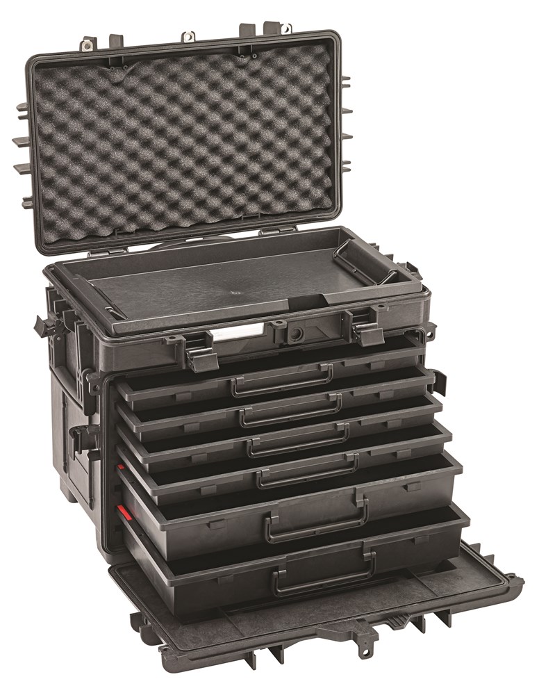 Contacteer onsZeer robuust en belastbaar voor professioneel gebruik, IP67, laag gewicht door het gebruik van ABS, 5 eenvoudig uitneembare, met transparante deksel afsluitbare schuifladen, schuifladen kunnen er in willekeurige volgorde worden ingeschoven, bovenop en voorop een afneembaar deksel, 1 uitneembare bak met 2 greep en 2 transparante schuifladendeksels onder de bovenste deksel, separaat documentenvak in het deksel, 4 posities voor naamplaatjes, 2 lichtlopende dubbele wielen aan de kant van de telescoopgreep, met 4 extra wielen leverbaar, waarvan 2 met vastzetrem (prijs op aanvraag), uittrekbare telescoopgreep om eenvoudig te transporteren, 2 draaggrepen aan de zijkant, resistent tegen skydrol, aceton, benzine en hydraulische oliën, 20 kg draagkracht, n,b,v, hangslot op 3 posities afsluitbaar, extra sloten en afdichtrubbers beschermen tegen water en stof, een speciaal ventiel zorgt voor drukcompensatie.