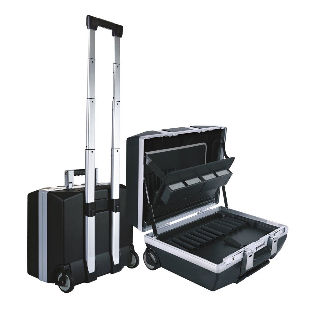 Contacteer onsRobuust en stijlvol design, drievoudige-frameconstructie uit gegoten aluminium, 3,5 mm ABS-buitenschaal, in het frame geïntegreerde scharnieren, rubberen wielen en vering, gasdrukcilinder maakt het openen en sluiten licht en veilig, aflopende hoeken tegen hoekschade, 4-traps trolley systeem 110 cm hoog, 2 uitneembare gereedschapsbladen, bodemafdekplaat en bodembak, afsluitbaar met 2 kantelsloten, 4 flexibele gereedschapshouders, 34 flexibele insteeklussen en documentenvak.