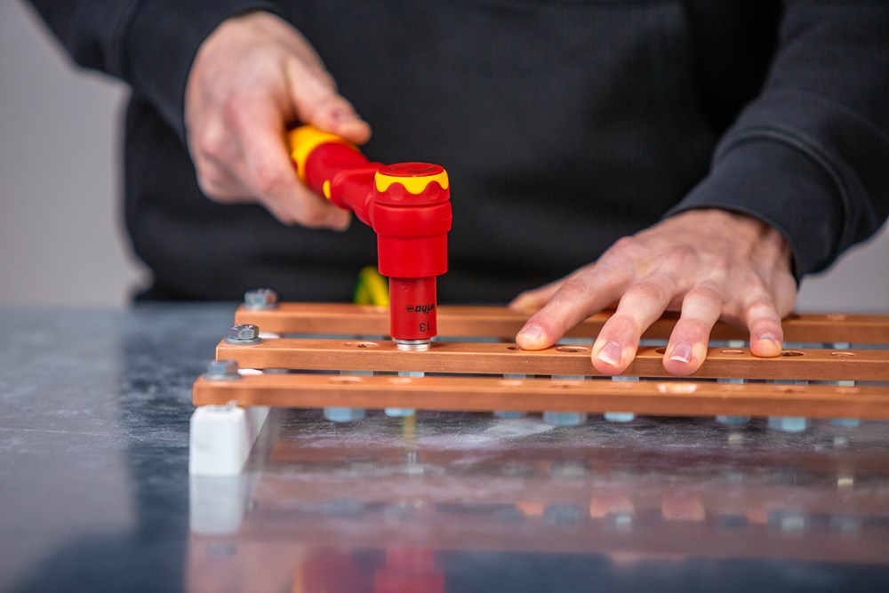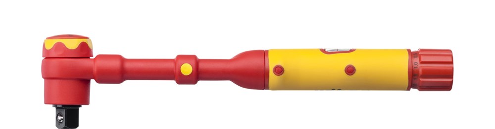 Bij werkzaamheden aan spanningvoerende delen komt de veiligheid voor de gebruiker op de eerste plaats. In het bijzonder bij schroefwerkzaamheden op railsystemen in verdeelkasten zijn elektriciens met de geïsoleerde momentsleutel met 10° schakelhoek optimaal uitgerust. De rechts-/linksdraaiende momentsleutel is ideaal voor krachtig, maar gecontroleerd vastdraaien. Door uittrekken en draaien van het uiteinde van de handgreep kan de vereiste momentwaarde met behulp van de numerieke schaalverdeling met de hand worden ingesteld. Verder bieden de op de 3/8'' vierkante aansluiting gestoken dopsleutels dankzij de kogelbeveiliging een betrouwbare grip Bij subtiel vastdraaien knikt het momentmechanisme in de sleutel merkbaar bij het bereiken van de ingestelde momentwaarde. De geïsoleerde momentsleutel wordt conform de internationale norm EN/IEC 60900 aan een 100% controle onderworpen en maakt veilig werken mogelijk nabij spanningvoerende delen tot 1.000 V AC.