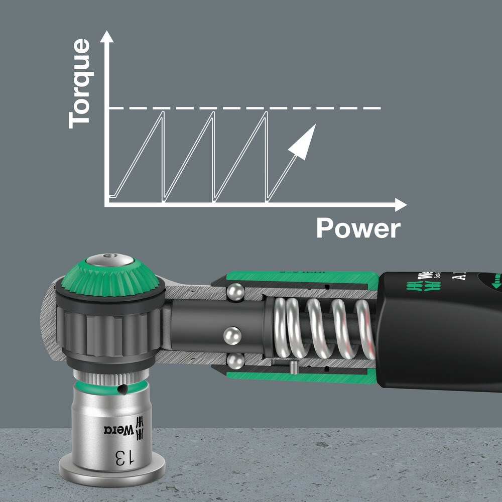 Eenvoudige instelling en borging van het gewenste draaimoment met hoor- en voelbaar doorratelen bij het bereiken van de schaalwaarde