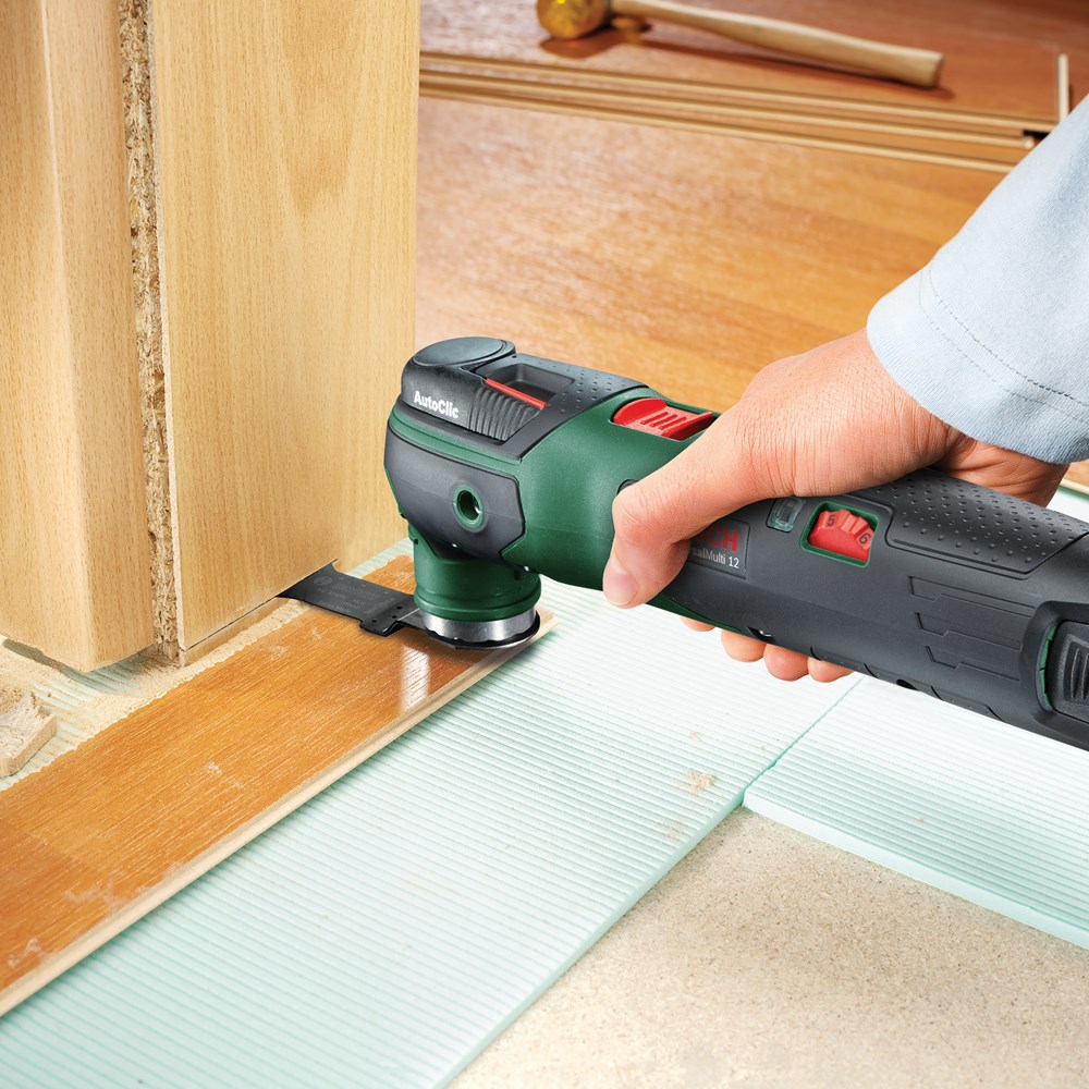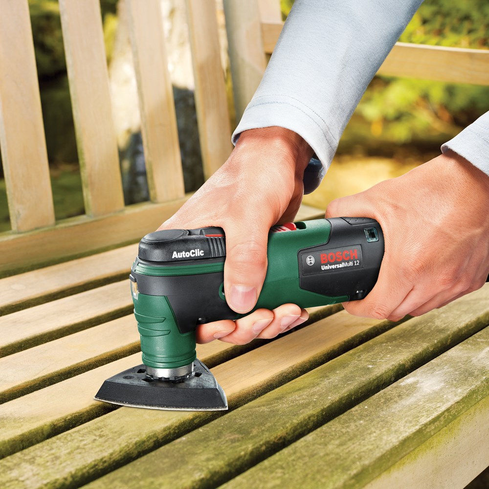 Veelzijdige, snoerloze allrounder waarbij in 3 seconden zonder sleutel accessoires kunnen worden gewisseld Dit veelzijdige, oscillerende multifunctionele 12V-gereedschap is de ideale keus om een groot aantal DIY-klussen aan te pakken. Met een krachtige motor en elektronische toerentalinstelling kunnen met de UniversalMulti 12 de toerentallen worden afgestemd op de eisen van elke klus en elk materiaal. Voor een beter zicht verlicht een led de werkplek. Dankzij Bosch AutoClic kunnen accessoires snel en gemakkelijk in 3 seconden worden gewisseld. Een groot assortiment optionele Starlock-accessoires bestrijkt een grote hoeveelheid toepassingen. Snijden, zagen, schuren, krabben, frezen en polijsten van hout, metaal, kunststof, gipsplaat, voegspecie en mortel. Het gereedschap maakt deel uit van het 12V POWER FOR ALL-systeem. Eén accu kan worden gebruikt voor alle 12V POWER FOR ALL-gereedschappen.