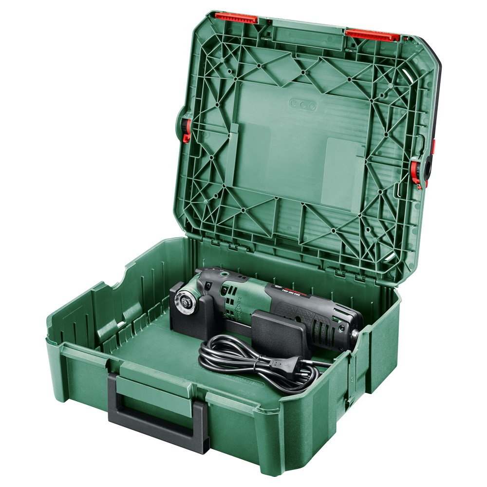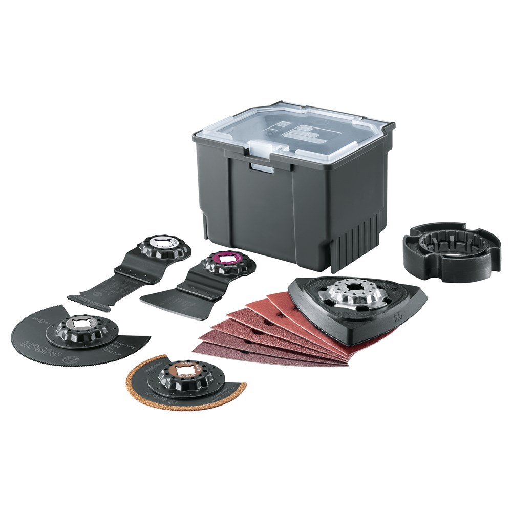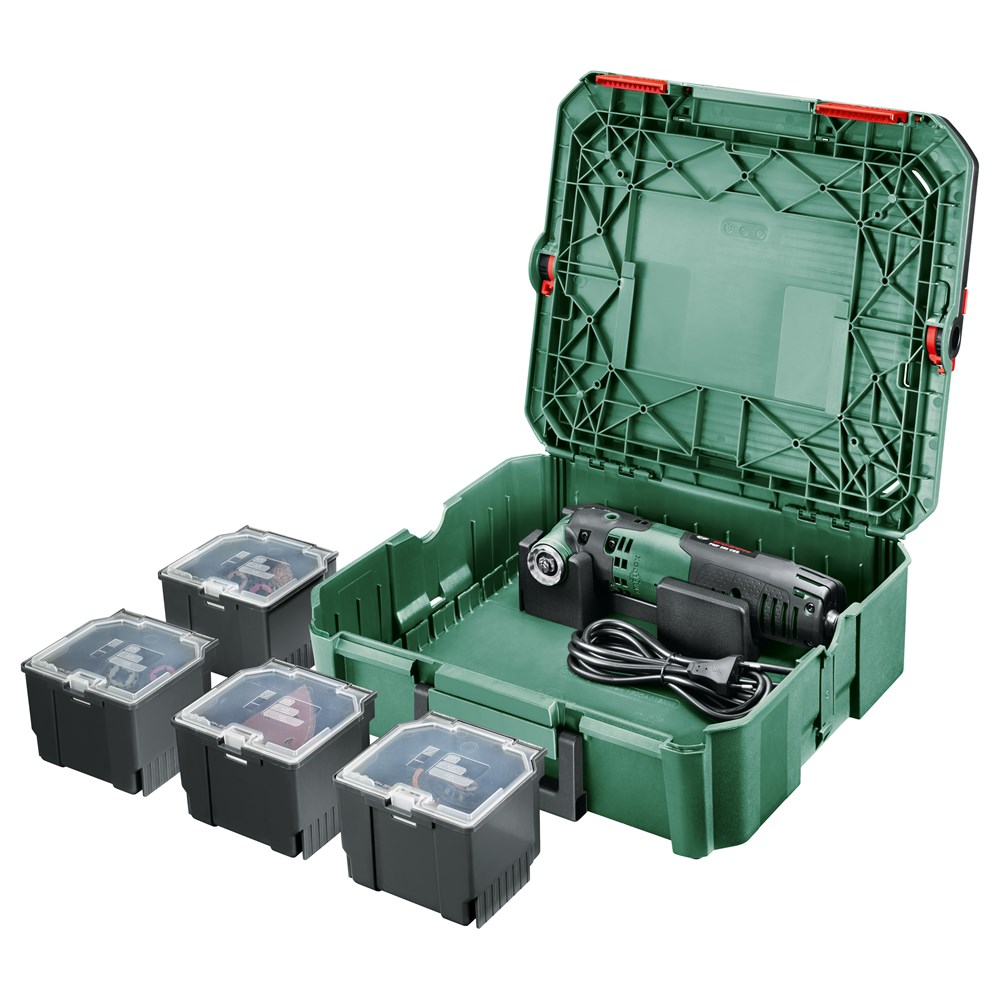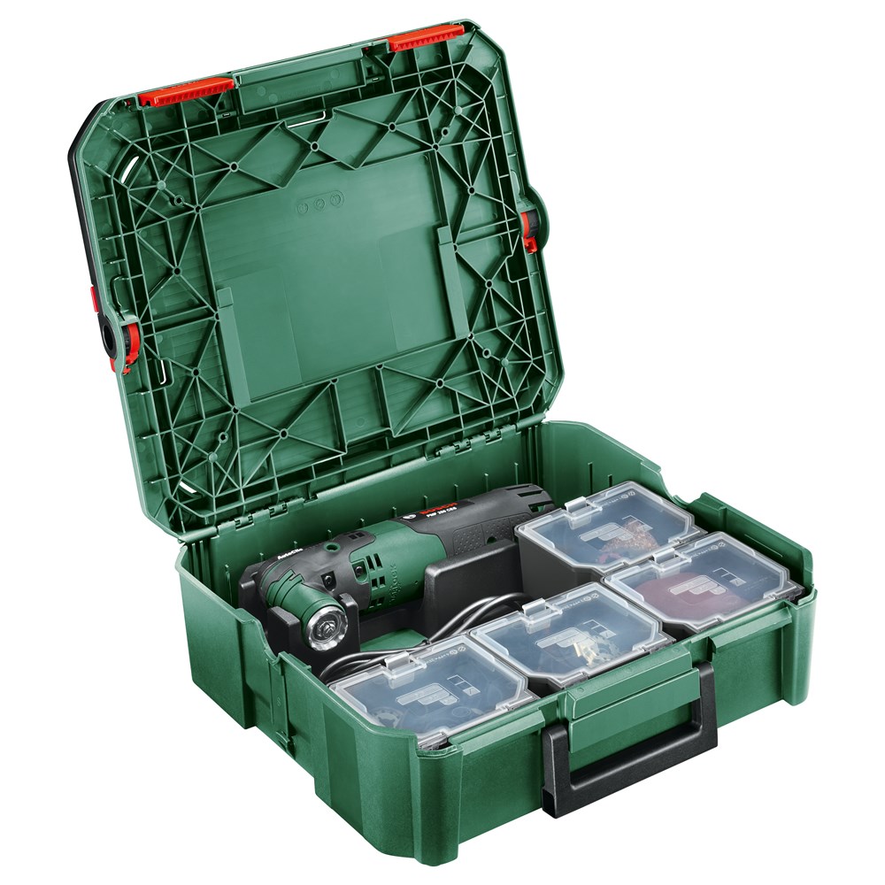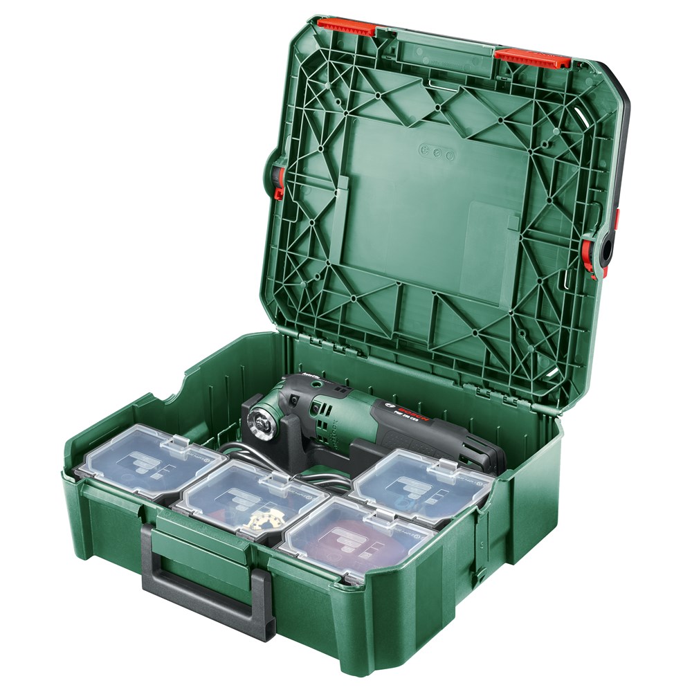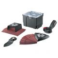 Multitool plus keuze uit één van vier projectsets – het juiste accessoire voor elke klus Projectset Schuren: maakt schuren, polijsten en gladmaken van ruwe oppervlakken en moeilijk bereikbare hoeken eenvoudig. Projectset Vloeren leggen: ideaal voor het installeren en repareren van houten vloerplanken, het verwijderen van tapijttegels en lijmresten of het gemakkelijk snijden van vloerbedekking. Projectset Betegelen: is de juiste keus voor doe-het-zelfklussen in keukens en badkamers. Van tegels tot oude leidingen pakken deze accessoires voegspecie, mortel en pleisterwerk aan. Projectset Universeel: voldoet aan de behoeften voor kleine doe-het-zelfklussen in en om het huis. Van schuren en betegelen tot en met vloeren leggen en snijden doen deze accessoires al het werk. De meegeleverde SystemBox kan worden gebruikt als perfecte opbergplaats voor losse onderdelen. De box kan worden uitgebreid met compatibele accessoireboxen in verschillende maten en een dekselbox. De SystemBox kan apart worden gebruikt of verschillende SystemBoxen kunnen aan elkaar worden gekoppeld. Met de geïntegreerde verticale en horizontale handgreep zijn SystemBoxen gemakkelijk te vervoeren naar elke werkplek.