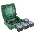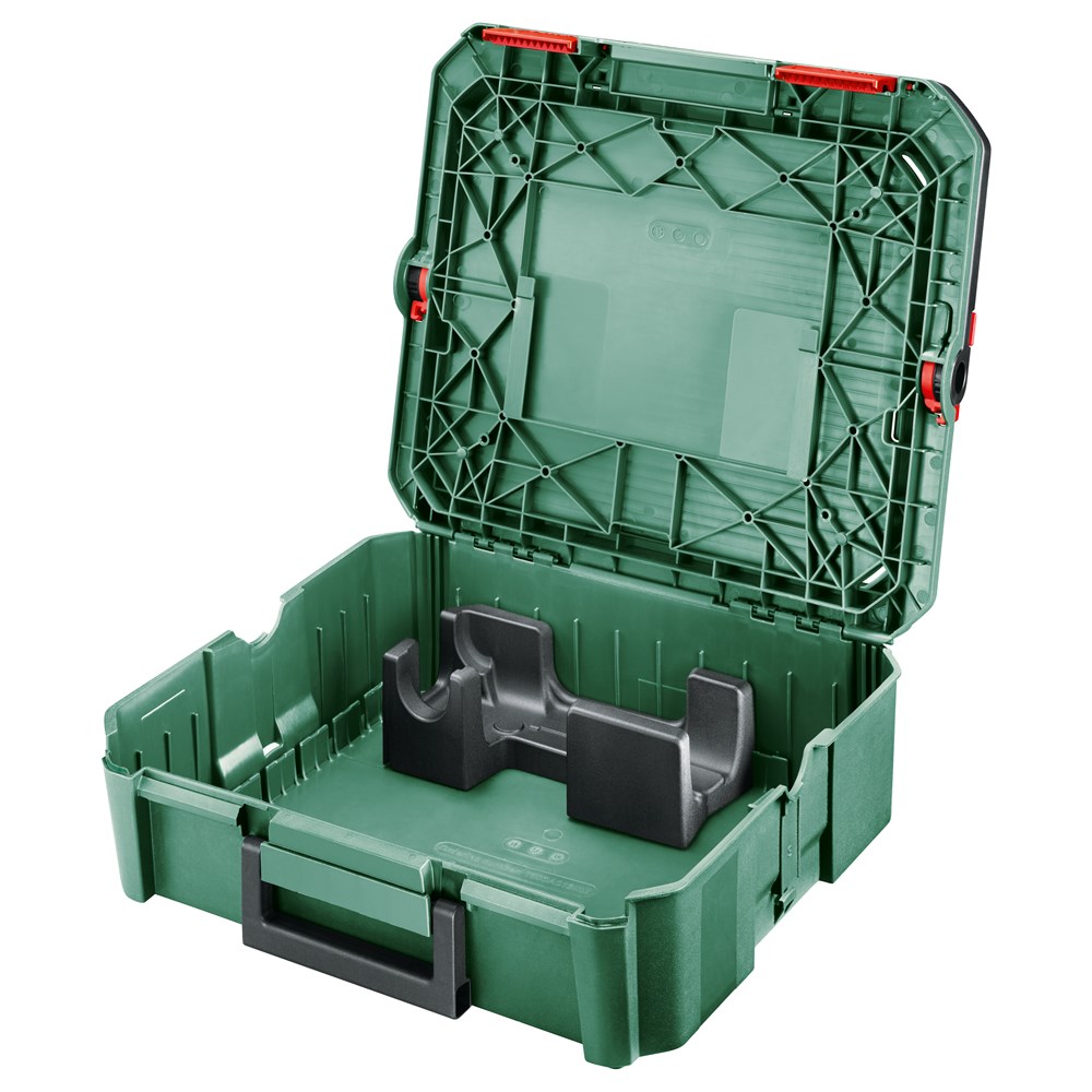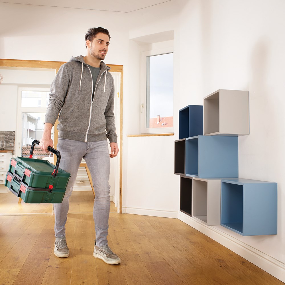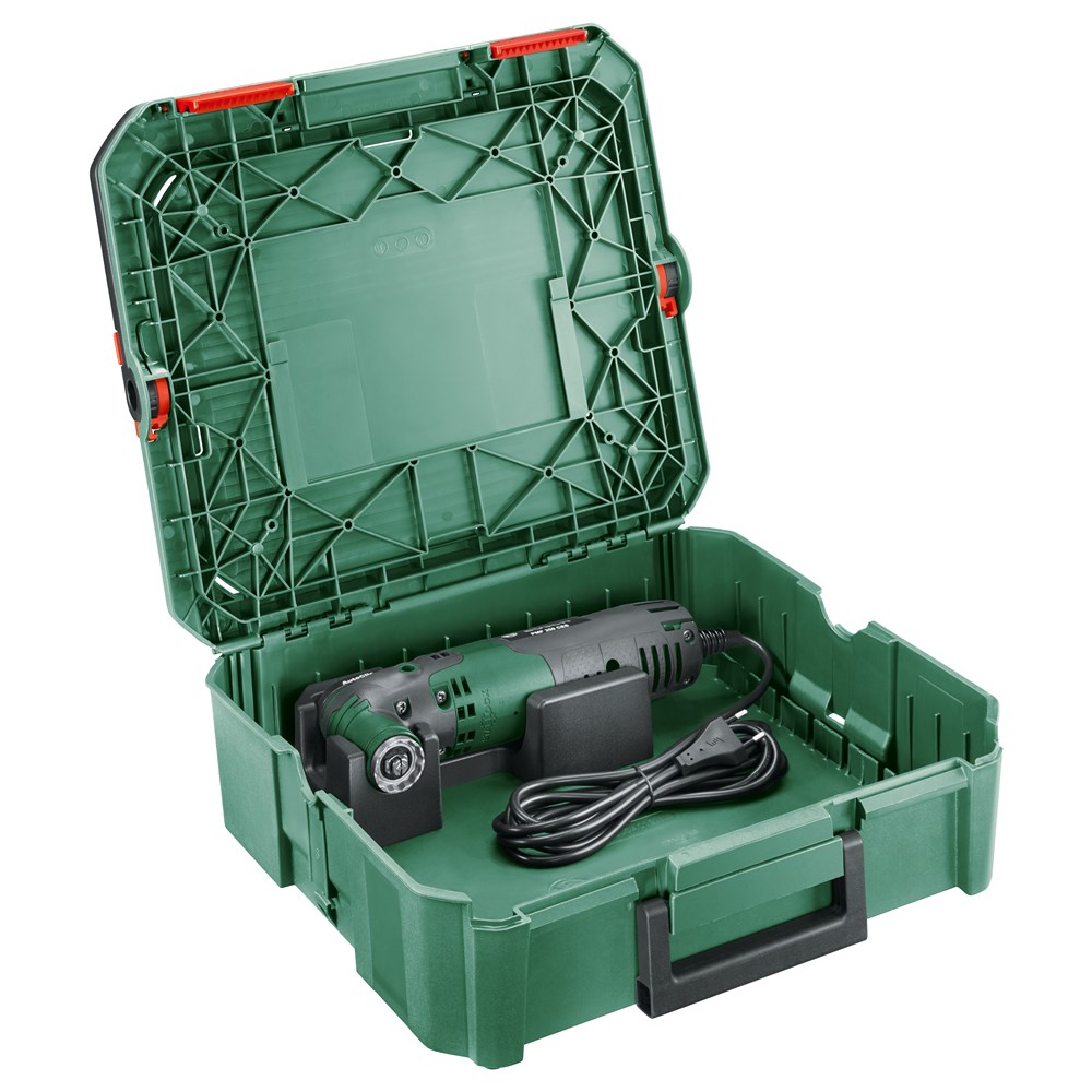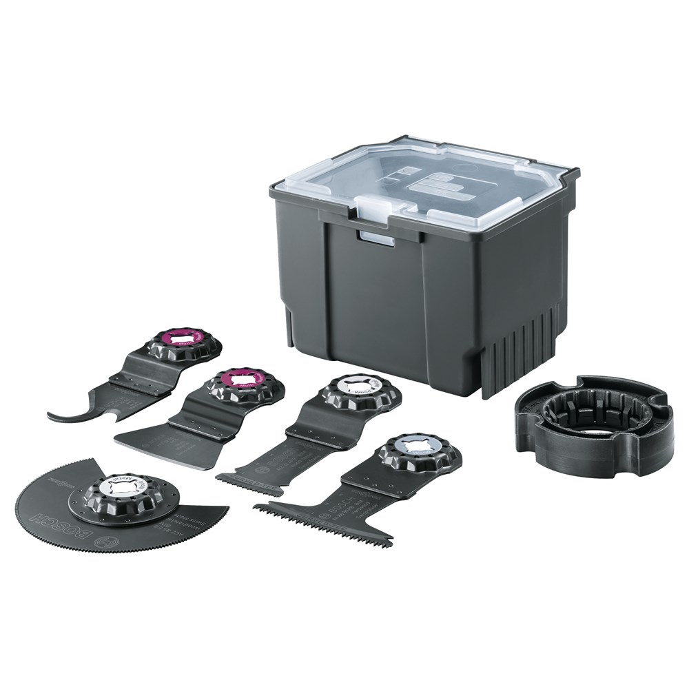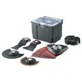Multitool plus keuze uit één van vier projectsets – het juiste accessoire voor elke klus Projectset Schuren: maakt schuren, polijsten en gladmaken van ruwe oppervlakken en moeilijk bereikbare hoeken eenvoudig. Projectset Vloeren leggen: ideaal voor het installeren en repareren van houten vloerplanken, het verwijderen van tapijttegels en lijmresten of het gemakkelijk snijden van vloerbedekking. Projectset Betegelen: is de juiste keus voor doe-het-zelfklussen in keukens en badkamers. Van tegels tot oude leidingen pakken deze accessoires voegspecie, mortel en pleisterwerk aan. Projectset Universeel: voldoet aan de behoeften voor kleine doe-het-zelfklussen in en om het huis. Van schuren en betegelen tot en met vloeren leggen en snijden doen deze accessoires al het werk. De meegeleverde SystemBox kan worden gebruikt als perfecte opbergplaats voor losse onderdelen. De box kan worden uitgebreid met compatibele accessoireboxen in verschillende maten en een dekselbox. De SystemBox kan apart worden gebruikt of verschillende SystemBoxen kunnen aan elkaar worden gekoppeld. Met de geïntegreerde verticale en horizontale handgreep zijn SystemBoxen gemakkelijk te vervoeren naar elke werkplek.