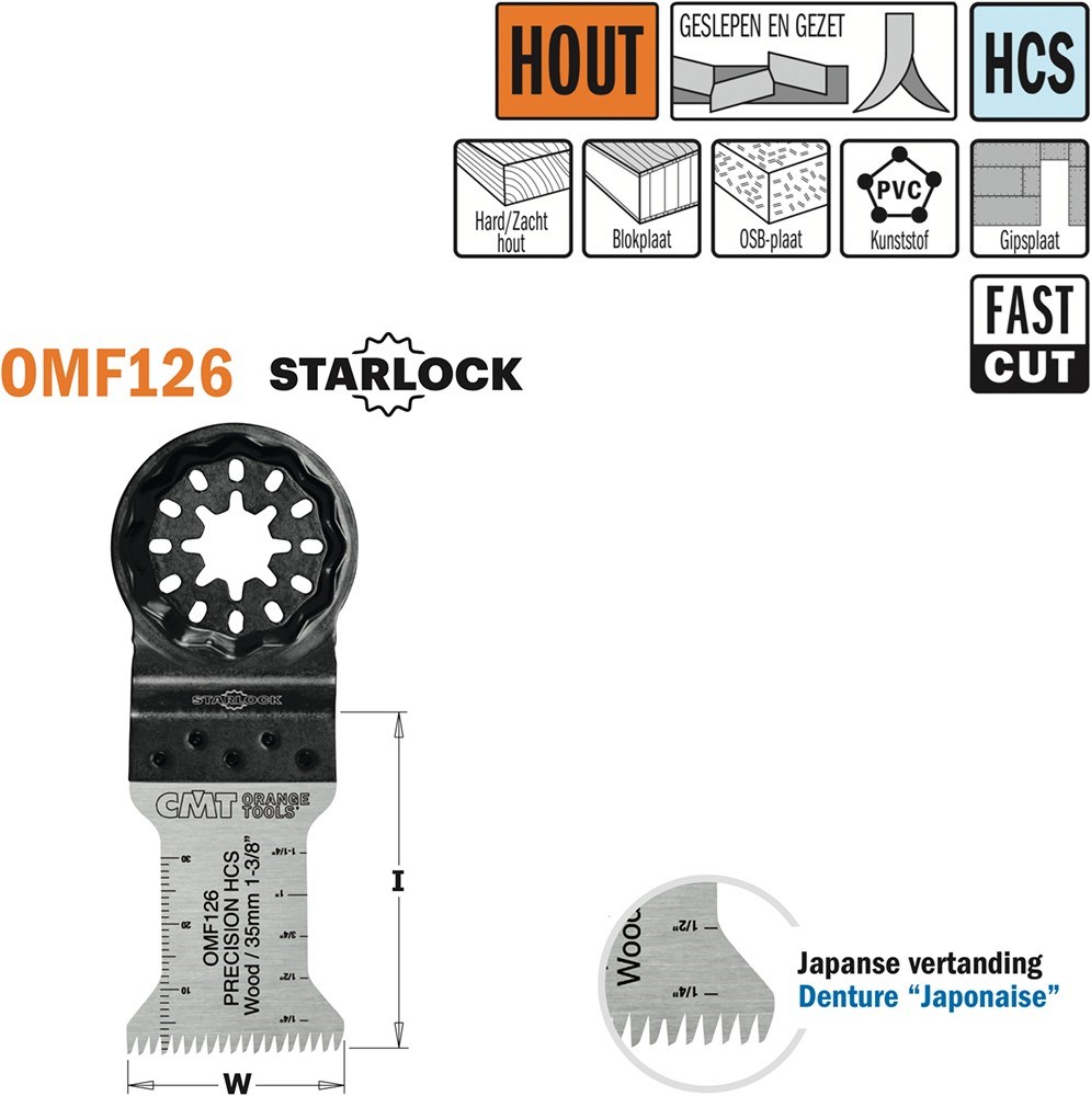 Contacteer onsCMT Artikelnummer: CTOMF126-X5 MULTITOOLZAAGBLAD (JAPANSE VERTANDING) VOOR HOUT. 35MM