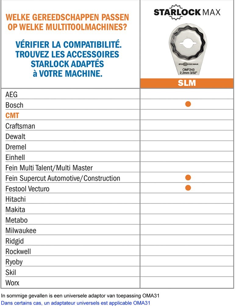 Contacteer onsCMT Artikelnummer: CTOMF160-X5 MULTITOOLZAAGBLAD VOOR HOUT MET SPIJKERS. 35MM