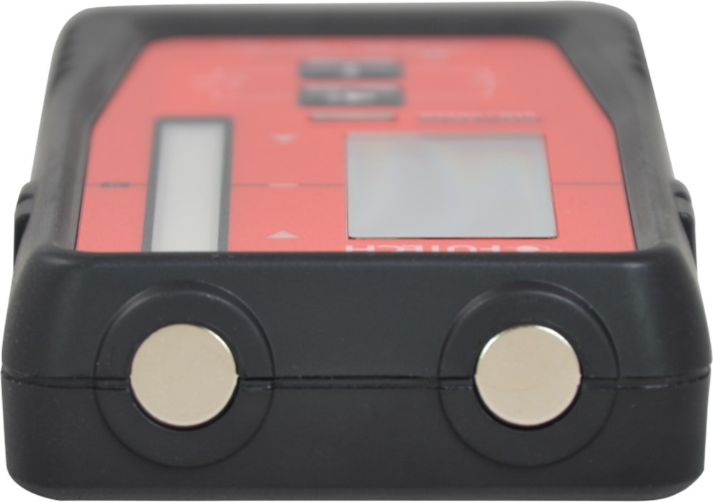 Contacteer onsMagnetische ontvanger voor rode en groene lijn- en rotatielasers met bereik van 75m (lijnlasers) of 400m (rotatielasers). Ontvangstveld van 60mm en aanduidingen op LCD display (op voor- en achterzijde van het toestel), LEDs (op voorzijde) en geluidsignalen. Geleverd met klem.