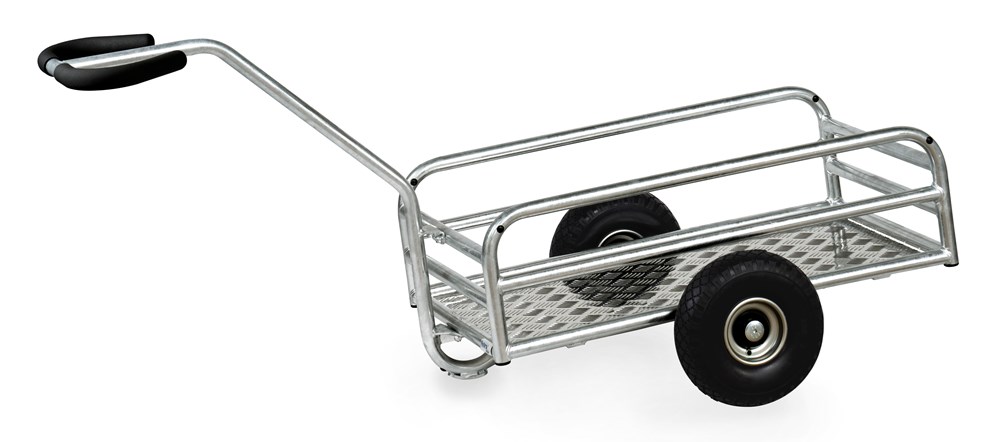 Contacteer onsHandtrekwagen voor buiten gebruik. Van gelaste stalen buis, vuurverzinkt. Laadvlak van aluminium kwintetplaat. Relingen 180/250 mm hoog met sterke buisprofielen. Aanschroefbare dissel met veiligheidshandgreep en huidvriendelijke Softgrip. Grote wielen met verzinkte stalen velg, met lekvrije polyurethaan banden, naaf met rollager. Geschroefde wielbevestiging voor het eenvoudig wissel van de wielen.