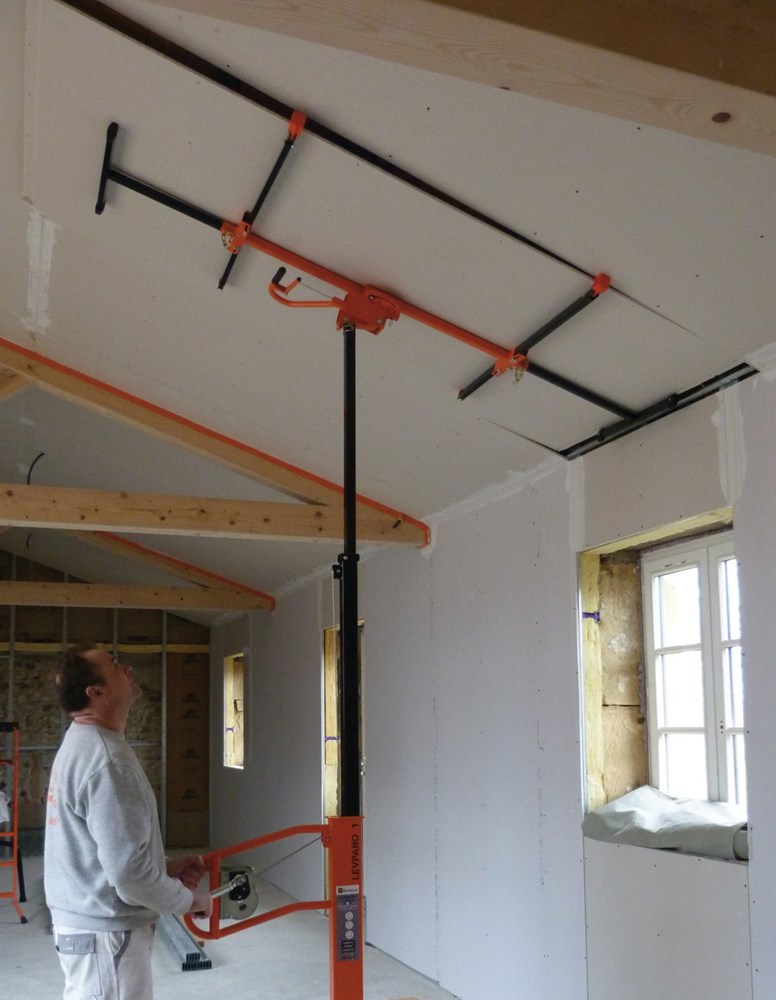 Contacteer onsBoven je macht tillen is zwaar en niet goed voor rug en schouders. Een platenlift is daarom een ergonimisch hulpmiddel voor snelle en makkelijke montage van gipsplaten tegen plafonds en schuine wanden. Voorzien van een 4-poot basis met montagebankjes en 4 geremde wielen Ø 125 mm. De lier is gepatenteerd en voorzien van 2 staalkabels: 1 werkkabel en 1 veiligheidskabel. Wanneer de werkkabel knapt zakt de mast niet in dankzij de extra kabel; veilig en bedrijfszeker! Voorzien van transportwielen en ingeklapt zeer compact, daardoor makkelijk te vervoeren.