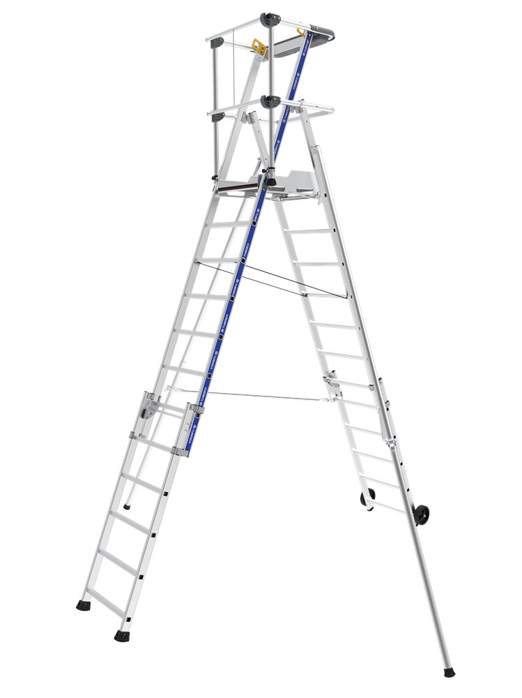 De Platformtrap. Veiligheid rondom.Bij de Platformtrap staat veiligheid voorop. Zo werk je namelijk altijd veilig met je handen vrij dankzij de leuningen rondom het werkplatform. Daarnaast heb je op dit plateau van wel 60 bij 40 centimeter altijd voldoende ruimte en stacomfort, ook tijdens langere werkzaamheden. De Platformtrap staat extra stabiel dankzij de telescopische stabilisator. De trap is zelf ook nog eens telescopisch verstelbaar. Handig, hierdoor sta je altijd op jouw gewenste hoogte. Zelfs op een ondergrond van ongelijk niveau. Deze vernuftige trap is perfect voor in de bouw of industrie.