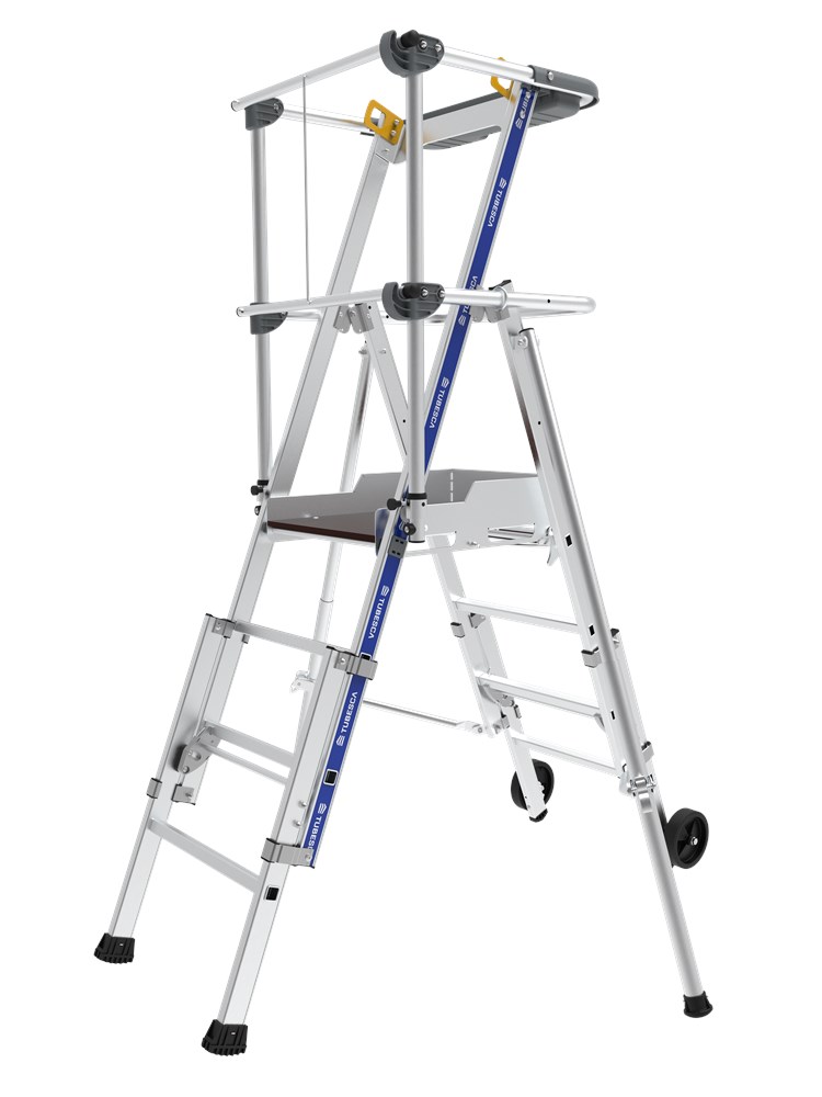 De Platformtrap. Veiligheid rondom.Bij de Platformtrap staat veiligheid voorop. Zo werk je namelijk altijd veilig met je handen vrij dankzij de leuningen rondom het werkplatform. Daarnaast heb je op dit plateau van wel 60 bij 40 centimeter altijd voldoende ruimte en stacomfort, ook tijdens langere werkzaamheden. De Platformtrap staat extra stabiel dankzij de telescopische stabilisator. De trap is zelf ook nog eens telescopisch verstelbaar. Handig, hierdoor sta je altijd op jouw gewenste hoogte. Zelfs op een ondergrond van ongelijk niveau. Deze vernuftige trap is perfect voor in de bouw of industrie.