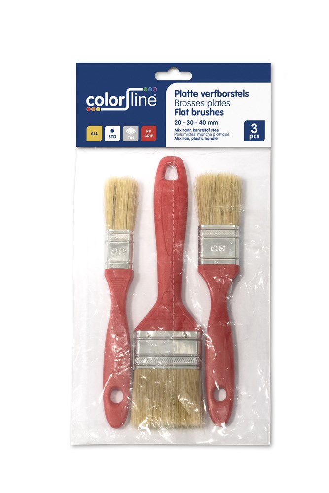 Contacteer onsCOLOR LINE Artikelnummer: PPBF 32985 SET VAN 3 PLATTE BORSTELS 20-30-40MM - ALLROUND - STD - MIX HAAR - RO
