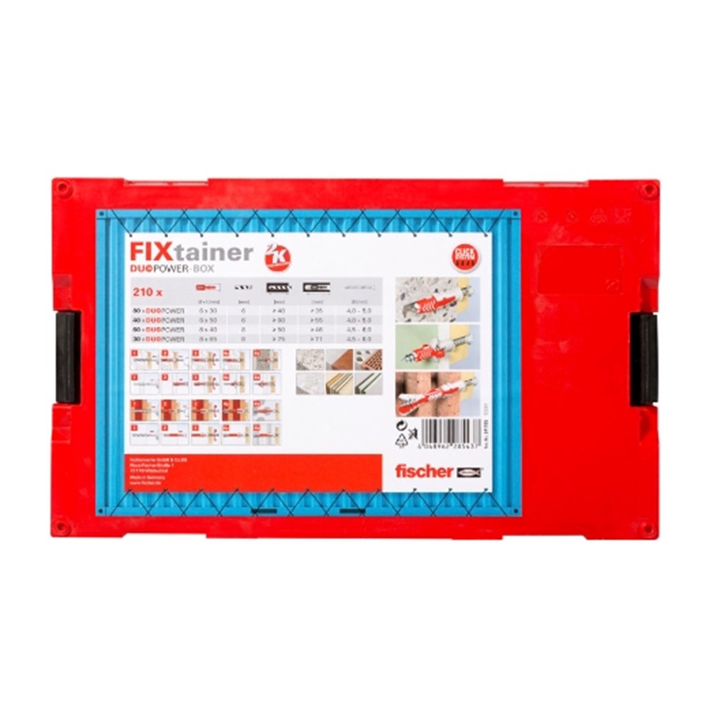 Contacteer onsDe FixTainer DuoPower assortimentsbox bevat de universele DuoPower plug in vier formaten: 80 x DuoPower 6 x 30, 40 x DuoPower 6 x 50, 60 x DuoPower 8 x 40, 30 x DuoPower 8 x 65 (210 stuks) .