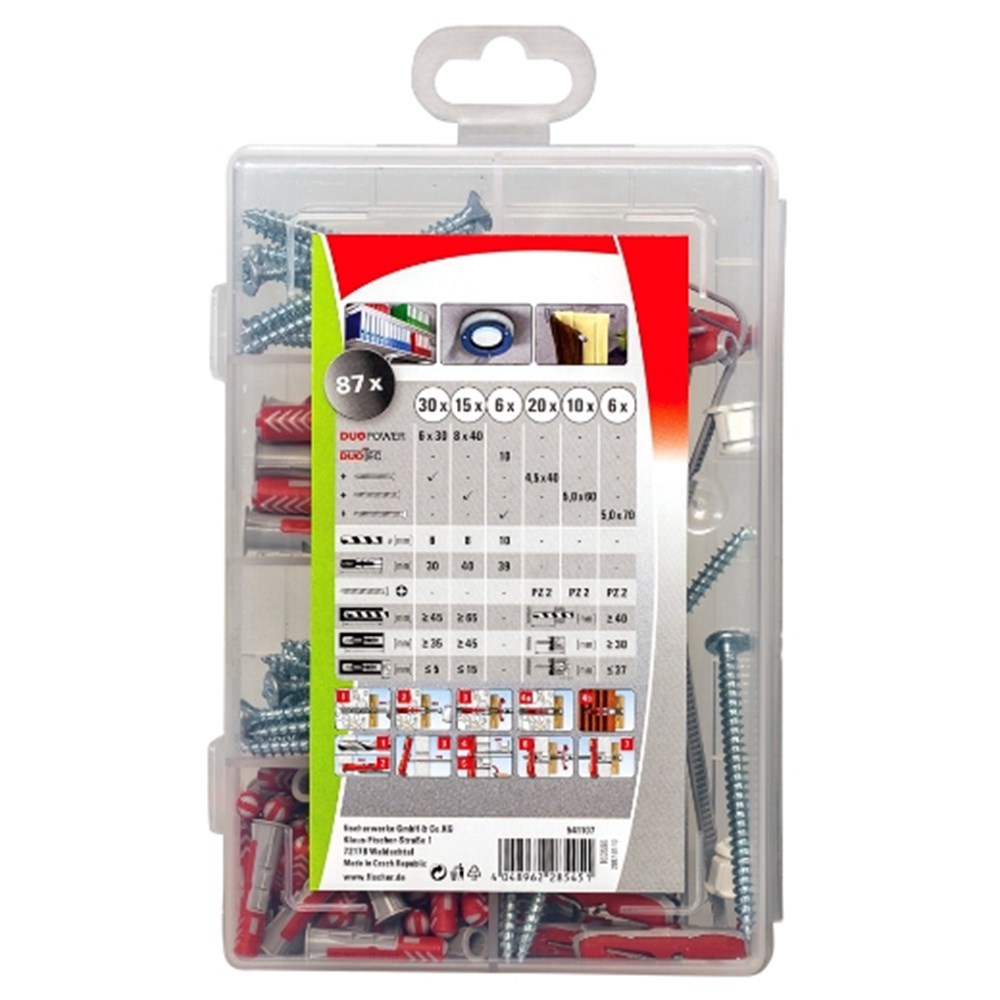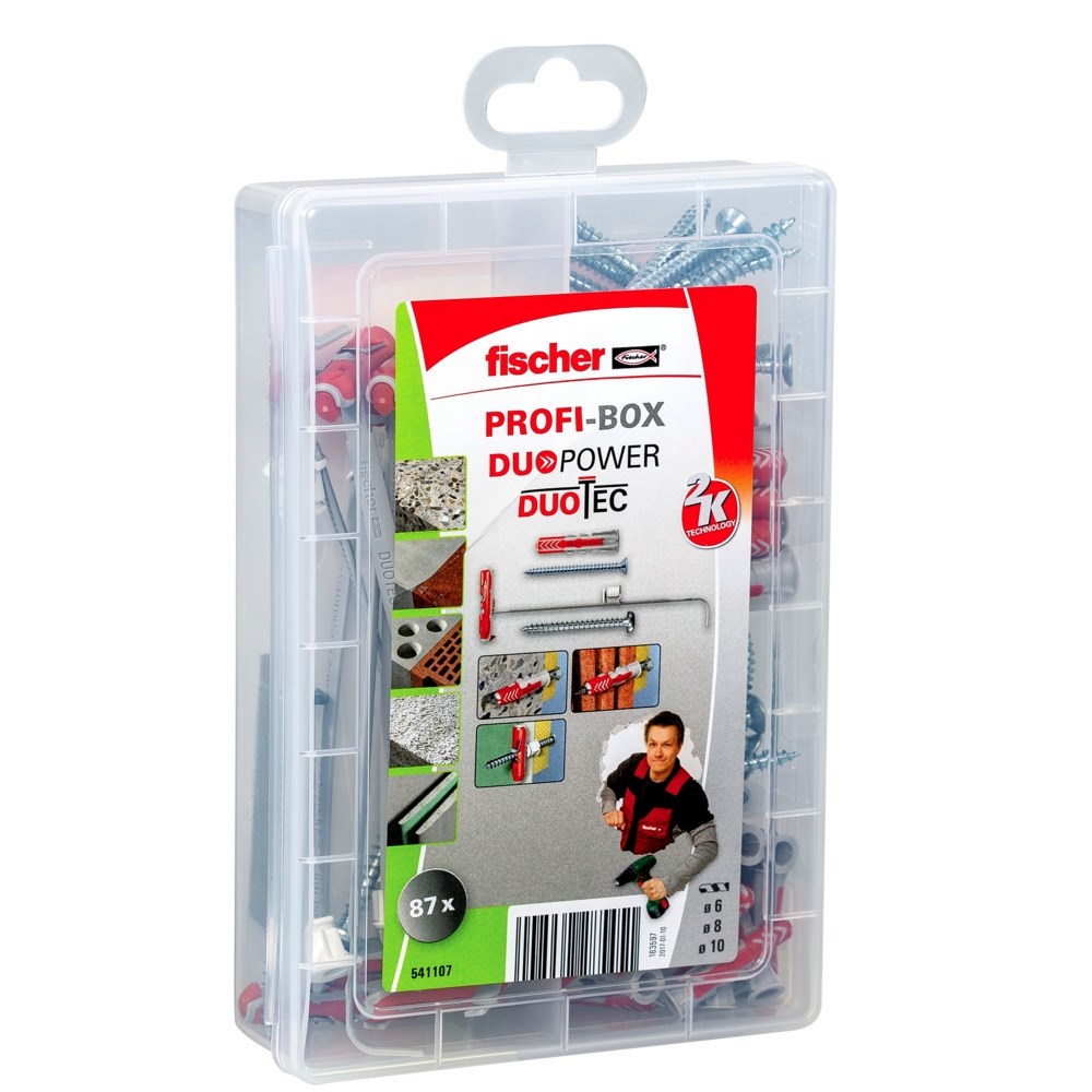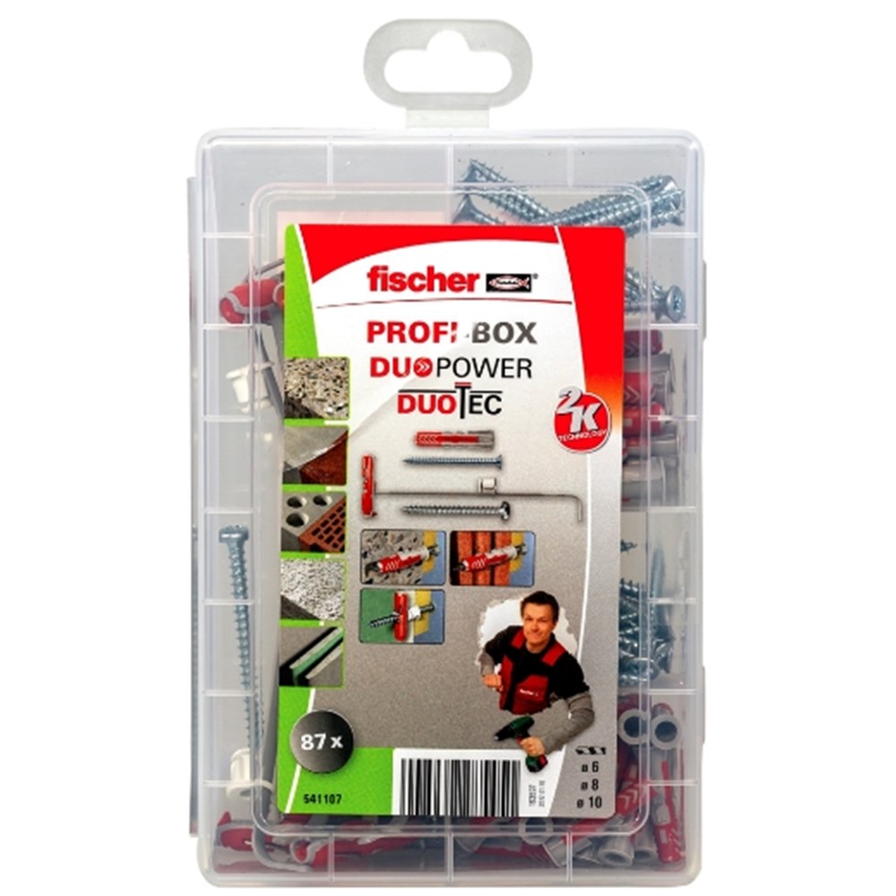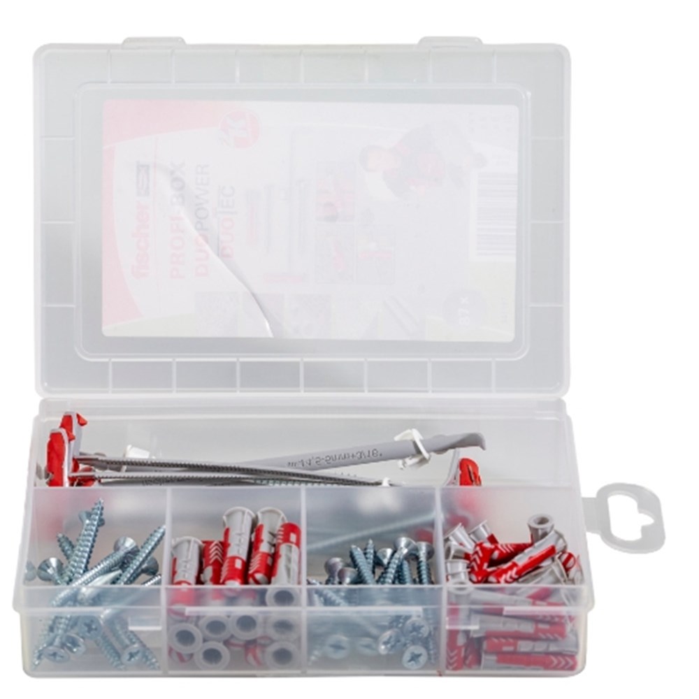 Contacteer onsDe fischer Profi-Box DuoPower en DuoTec bevat 30 DuoPower 6 x 30, 15 DuoPower 8 x 40 en 20 spaanplaatschroeven 4,5 x 40 en 10 spaanplaatschroeven 5 x 60. De doos bevat ook 10 DuoTec tuimelpluggen en 6 bolkopschroeven 5.0 x 70. De Profi-Box, gemaakt van hoogwaardig en slagvast kunststof, is ideaal voor werkplaats en bouwplaats. De transparante deksel geeft het overzicht in één oogopslag. De fischer Profi-Box sluit veilig en kan met pluggen worden bijgevuld.
