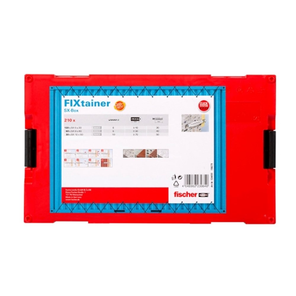 Contacteer onsDe SX-box bevat 210 fischer SX-pluggen - geschikt voor bevestigingen in beton, massieve en holle bouwmaterialen. De FixTainer-boxen worden geleverd met een handvat en een transparant deksel. Ze kunnen stevig met elkaar worden gekoppeld. Bovendien zijn ze compatibel met het Sortimo L-Boxx-systeem.