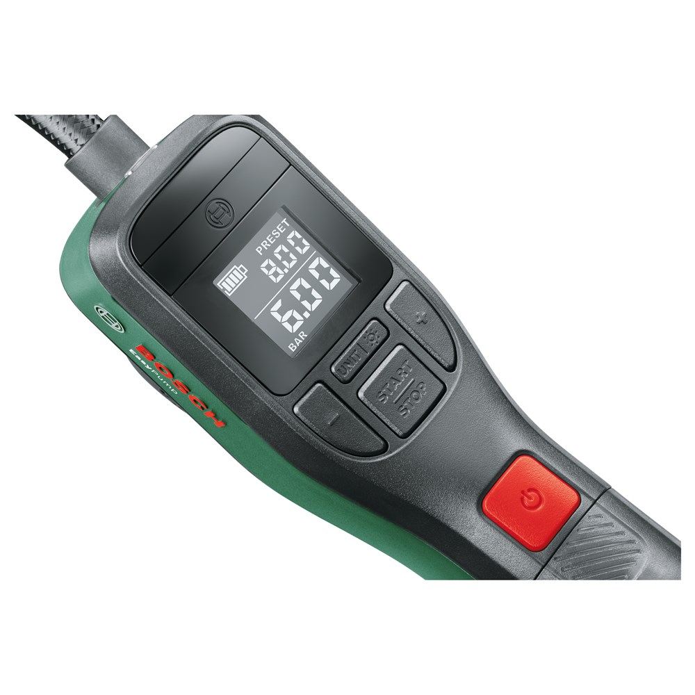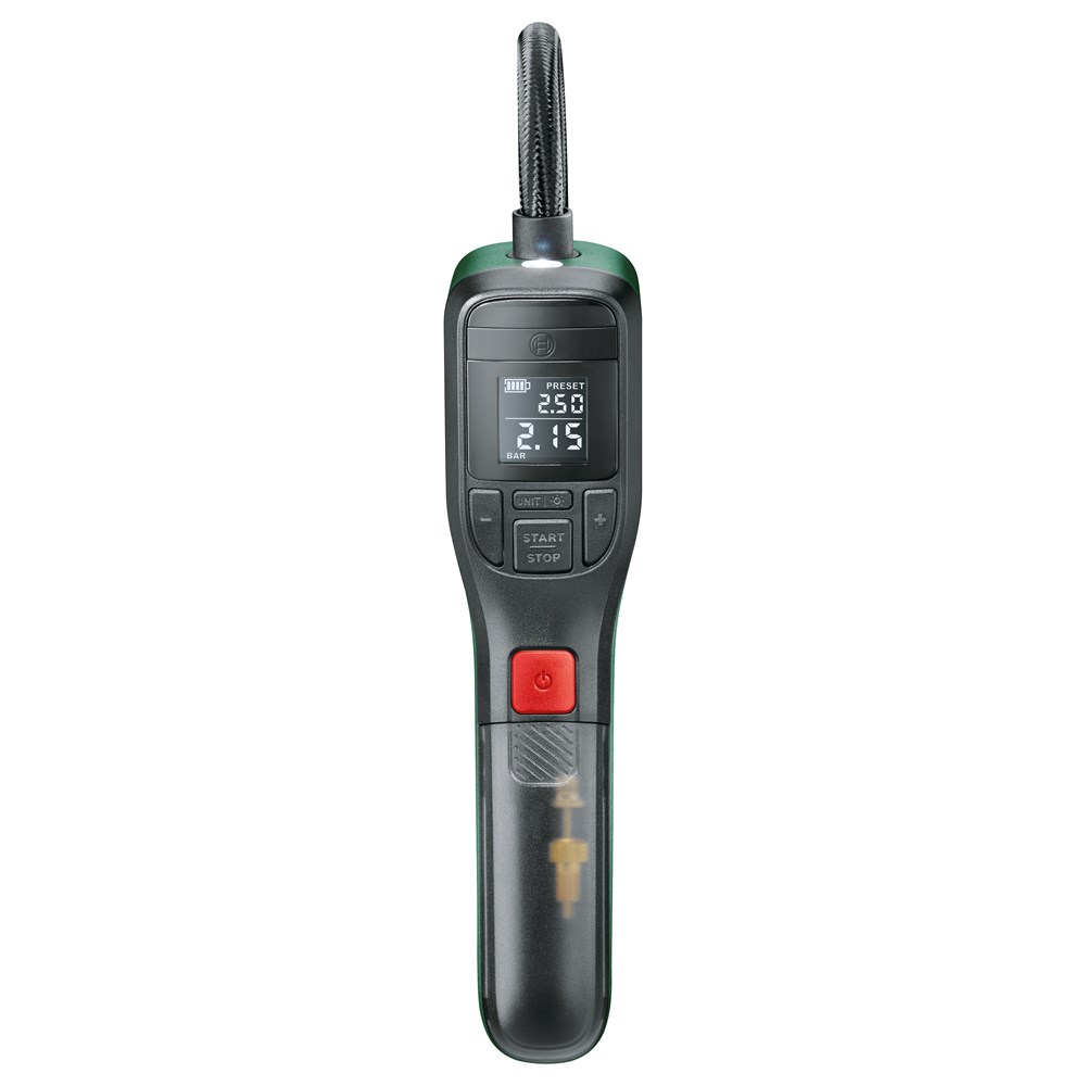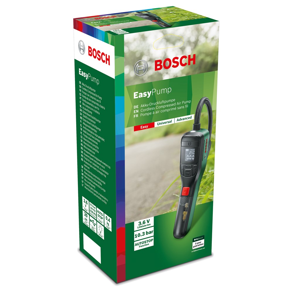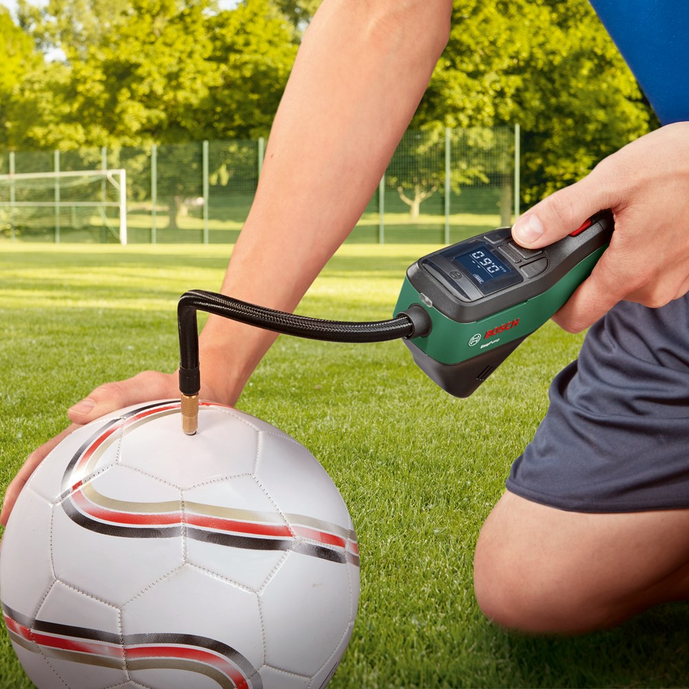 Pump It Up: de persluchtpompsensatie op accu voor intuïtief, dagelijks gebruik Klein gereedschap, grote prestatie: de EasyPump is de intuïtieve luchtpomp van Bosch voor alle toepassingen tot max. 10,3 bar. De realtime meting van de pomp en de voorkeuzefunctie ondersteunen comfortabele en nauwkeurige resultaten bij het oppompen. De pomp heeft een duidelijke gebruikersinterface met een groot display dat bij daglicht afleesbaar is. Het compacte en lichte ontwerp zorgt ervoor dat de pomp ideaal kan worden meegenomen. Uitgerust met diverse adapters, die netjes in het opbergvak zijn opgeborgen, kan de EasyPump allerlei soorten banden (bijv. van auto, fiets), ballen (bijv. voetballen) en zelfs kleine watersportartikelen oppompen. Opblazen was nog nooit zo gemakkelijk.