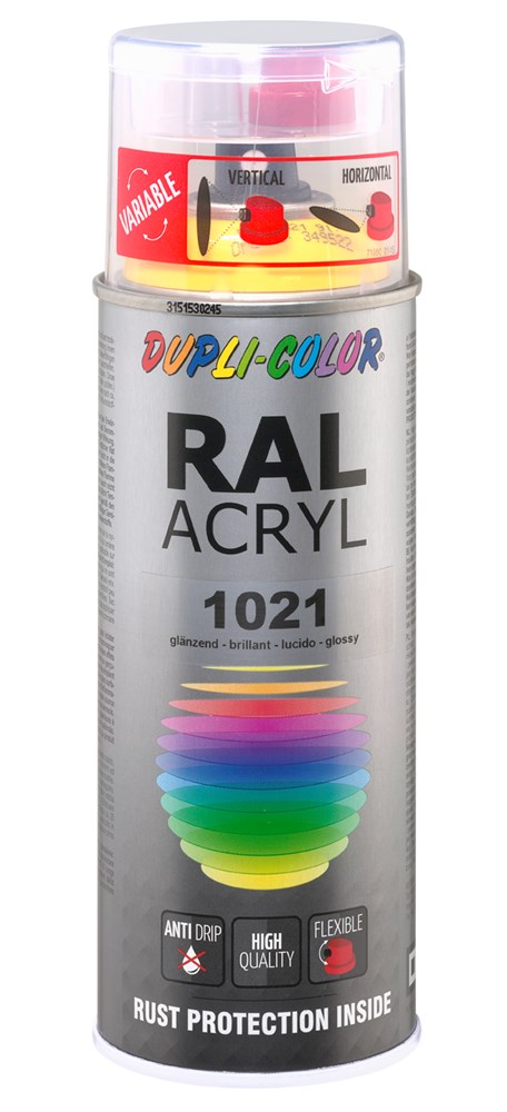 Contacteer onsDUPLI-COLOR Artikelnummer: MV349522 DUPLICOLOR ACRYL 400ML HG RAL 1021 KOOLZAAD GEEL