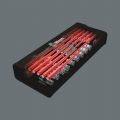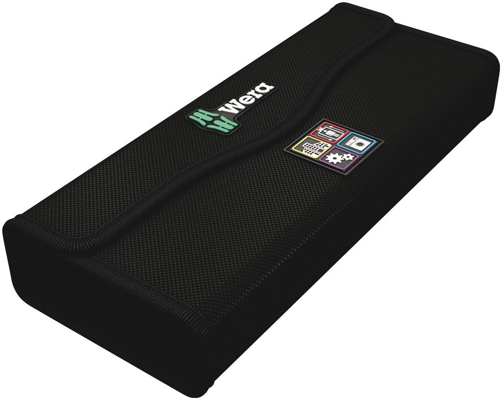 Compacte gereedschapsset met de 35 belangrijkste schroefgereedschappen voor het verrichten van servicewerkzaamheden binnen en buiten. Met VDE handgreep incl. 12 VDE klingen; 1 Joker dubbele steeksleutel met vasthoudfunctie, hoekaanslag, kleine terughaalhoek en extreem vastgrijpende tanden; met de ongelooflijk snelle 1/4" ratel Zyklop Speed incl. accessoires; 8 hand- en machinedoppen in de formaten 5,5-13, 1 universele bithouder; 7 25 mm bits; 1 schroefklauw voor het vasthouden van schroeven; 1 spanningszoeker 247; uiterst compact stoffen etui met hoge robuustheid en lange levensduur; rechtop te plaatsen voor overzichtelijke opslag in gereedschapsrek; vanwege de stoffen buitenzijde ook probleemloos op kwetsbare oppervlakken te leggen; laag gewicht en gering volume en daardoor makkelijk mee te nemen.