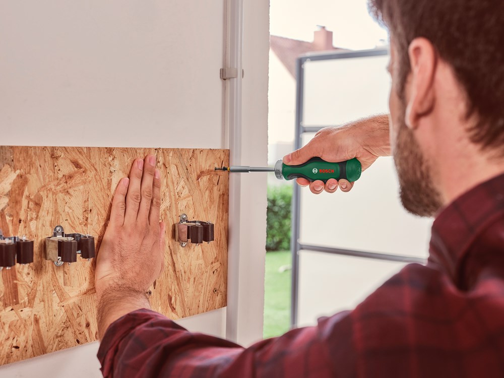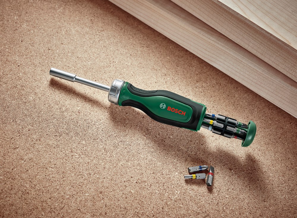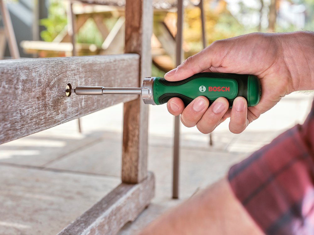 De krachtige, ergonomische ratelschroevendraaier voor precies werken, zelfs op krappe plekken De Bosch ratelschroevendraaier met 12 bits in de handgreep is een klasse apart voor gecontroleerd en moeiteloos schroeven. De ratel heeft een poedermetallurgisch drijfwerk met 36 tanden, waarmee een draaimoment van maximaal 50 Nm mogelijk is. Voor een snelle richtingwissel kan een intuïtieve metalen ring van links naar rechts worden gedraaid, terwijl de middenpositie is bedoeld voor handmatige schroefklussen zonder ratelfunctie. Bij het uitoefenen van meer kracht blijven de bits stevig op hun plek dankzij de magnetische bithouder van het gereedschap. Deze schroevendraaier heeft een schacht van 80 mm voor eenvoudig en precies werken. Voor extra gemak beschikt de handgreep van de schroevendraaier over een pop-up bitdepot met 12 bits met kleurcodering in diverse maten (PH, PZ, SL, TX, HEX) die zijn gemaakt van hard S2-staal. Voor meer werkcomfort en controle is deze ratelschroevendraaier compact en ergonomisch ontworpen met een tweecomponenten handgreep en grote vlakken met softgrip.