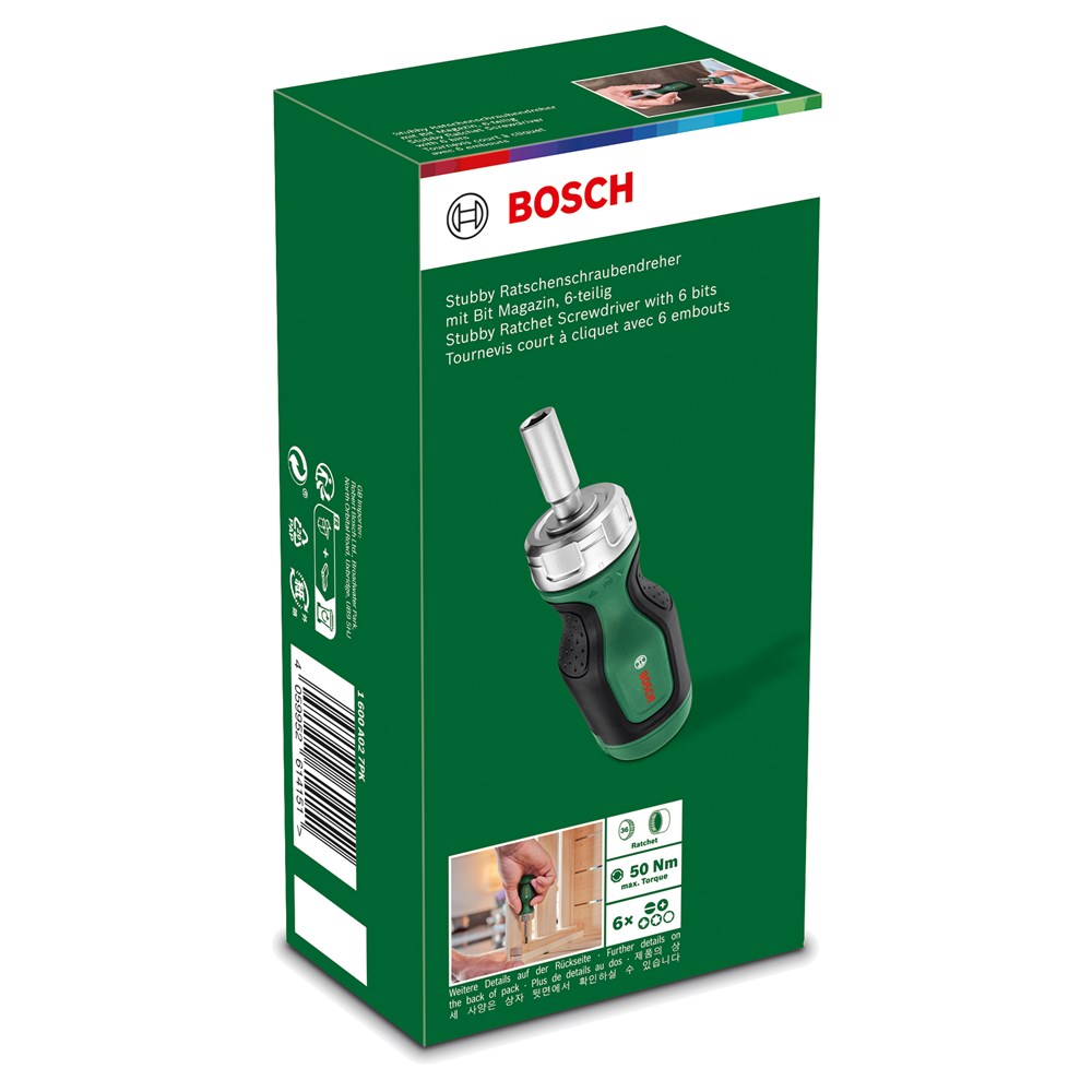 Moeiteloos schroeven met compacte en sterke korte ratelschroevendraaier De Bosch korte ratelschroevendraaier met 6 bits in de handgreep is de comfortabele en praktische allrounder voor snel en efficiënt doe-het-zelven. De ratel die is gemaakt van een poedermetallurgisch drijfwerk met 36 tanden, levert een indrukwekkend hoog draaimoment van maximaal 50 Nm. Een intuïtieve metalen ring maakt een snelle draairichtingwissel mogelijk door deze van links naar rechts te draaien, en er is een middenpositie voor handmatig schroeven. Een sterke magnetische houdkracht houdt de bits op hun plek, en het juiste bit is altijd bij de hand dankzij het 6-delige bitdepot met bits van hard S2-staal met kleurcodering. Deze ratelschroevendraaier is ergonomisch gemaakt voor comfort met een tweecomponenten handgreep met softgrip en het compacte formaat maakt schroef- en precisieklussen op moeilijk bereikbare plaatsen gemakkelijk.