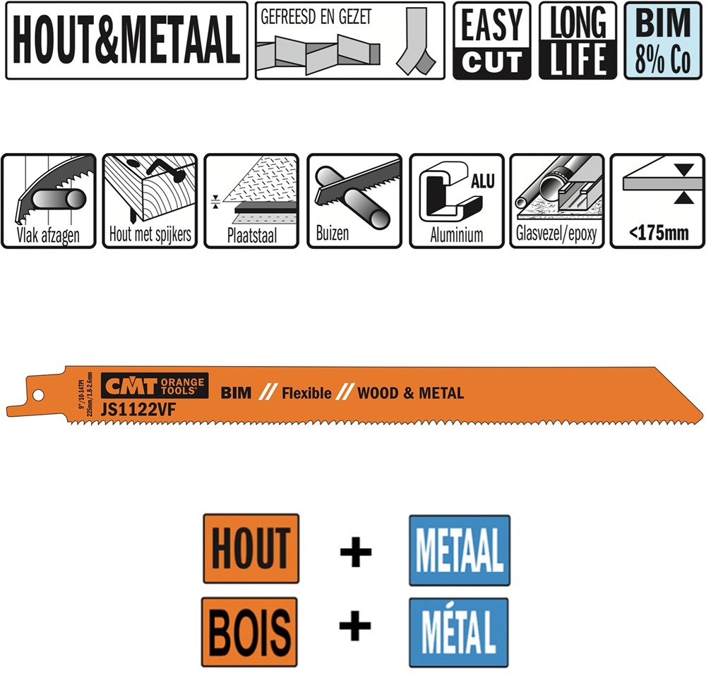 Contacteer onsArtikelnummer: CTJS1122VF-5 RECIPROZAAGBLAD BI-METAAL 225MM X 0.9 X 10-14TPI