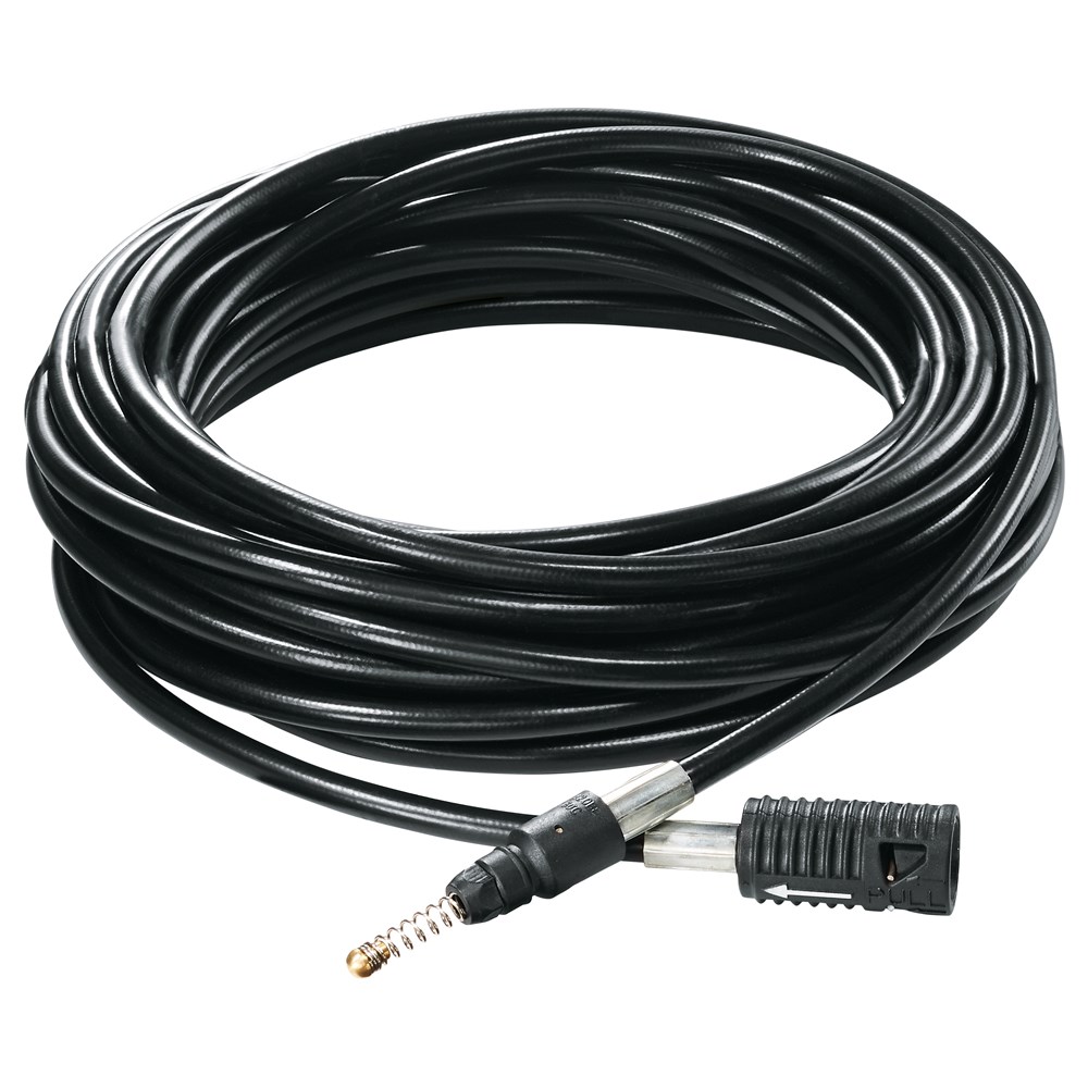 Maakt verstopte regenpijpen en afvoeren in een mum van tijd weer vrij De 10 meter lange rioolreiniger is handig om verstoppingen buiten aan te pakken. Deze kan snel worden aangesloten op de drukreinigerlans om snel te kunnen beginnen met het werk. Zodra de rioolreiniger in een afvoer of pijp is ingebracht, drijven achteruit wegspuitende stralen in de sproeier hem vooruit en verwijdert vuil dat hij onderweg tegenkomt. Gelijkmatig aangebrachte markeringen en een markeringsring geven de voortgang aan, terwijl de reiniger zich een weg baant door de te reinigen gebieden. Voor krachtig werken kan een waterdruk van max. 160 bar worden ingesteld.