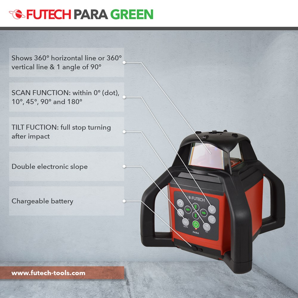Contacteer onsMultifunctionele groene rotatielaser voor binnen- en buitengebruik (IP66) met verticale modus (Z-as) en bereik van 2x 300m met inbegrepen ontvanger (Bull Groen). Elektronische motornivellering met nauwkeurigheid van 1mm/10m en dubbele helling (X + Y-as). Beschikt over tiltfunctie, scanfunctie en netstroomadapter/lader voor onbeperkte autonomie.