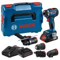 De krachtige GSR 18V-90 FC Professional maakt deel uit van het Bosch Professional FlexiClick System, waarmee u alle uitdagingen op de bouwplaats de baas kunt: met het excentrische opzetstuk kan dichtbij randen en muren worden gewerkt, terwijl het haakse opzetstuk de schroefboormachine in een haakse boormachine verandert. Deze opzetstukken kunnen in 16 verschillende standen in een hoek van 360° worden vergrendeld zonder dat ze van de machine hoeven te worden genomen. Bevestiging van het unieke hameropzetstuk GFA 18-H verandert de machine in een volwaardige SDS plus boorhamer die klaar is voor moeiteloos hameren in beton tot Ø 10 mm. Met een koplengte van slechts 136 mm en een max. hard draaimoment van 64 Nm heeft u een zeer compacte en krachtige machine in de hand. Het Bosch Professional FlexiClick System: perfect uitgerust voor een professionele klus.