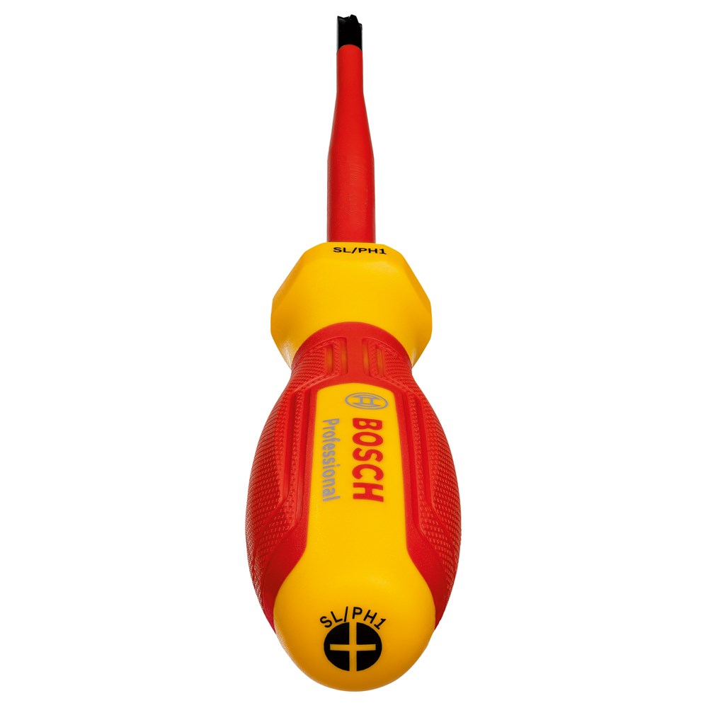 Professionals hebben gereedschappen nodig die eenvoudig in gebruik zijn en die aan alle wettelijke eisen voldoen. Met de Bosch Professional schroevendraaier kunnen schroeven wordt vast- en losgedraaid, zelfs als er onverwacht contact met spanningvoerende onderdelen wordt gemaakt. Dit gestandaardiseerde gereedschap is geïsoleerd met thermoplastisch elastomeer (TPE). Het is getest tot max. 10.000 volt en VDE-gecertificeerd tot max. 1000 volt conform DIN EN/IEC 60900. Onze VDE schroevendraaier is precies en duurzaam; de slanke schacht en robuuste punt zorgen voor een nauwkeurige pasvorm. De softgrip en het superieure ergonomische ontwerp zorgen ervoor dat het gereedschap goed in de hand ligt en er comfortabel mee kan worden gewerkt. Het S2-blad van de schroevendraaier heeft een beschermende isolatielaag en de handgreep is geïsoleerd met TPE. Door VDE handgereedschappen aan ons Bosch Professional programma toe te voegen zijn alle gereedschappen in betrouwbare Bosch kwaliteit verkrijgbaar.