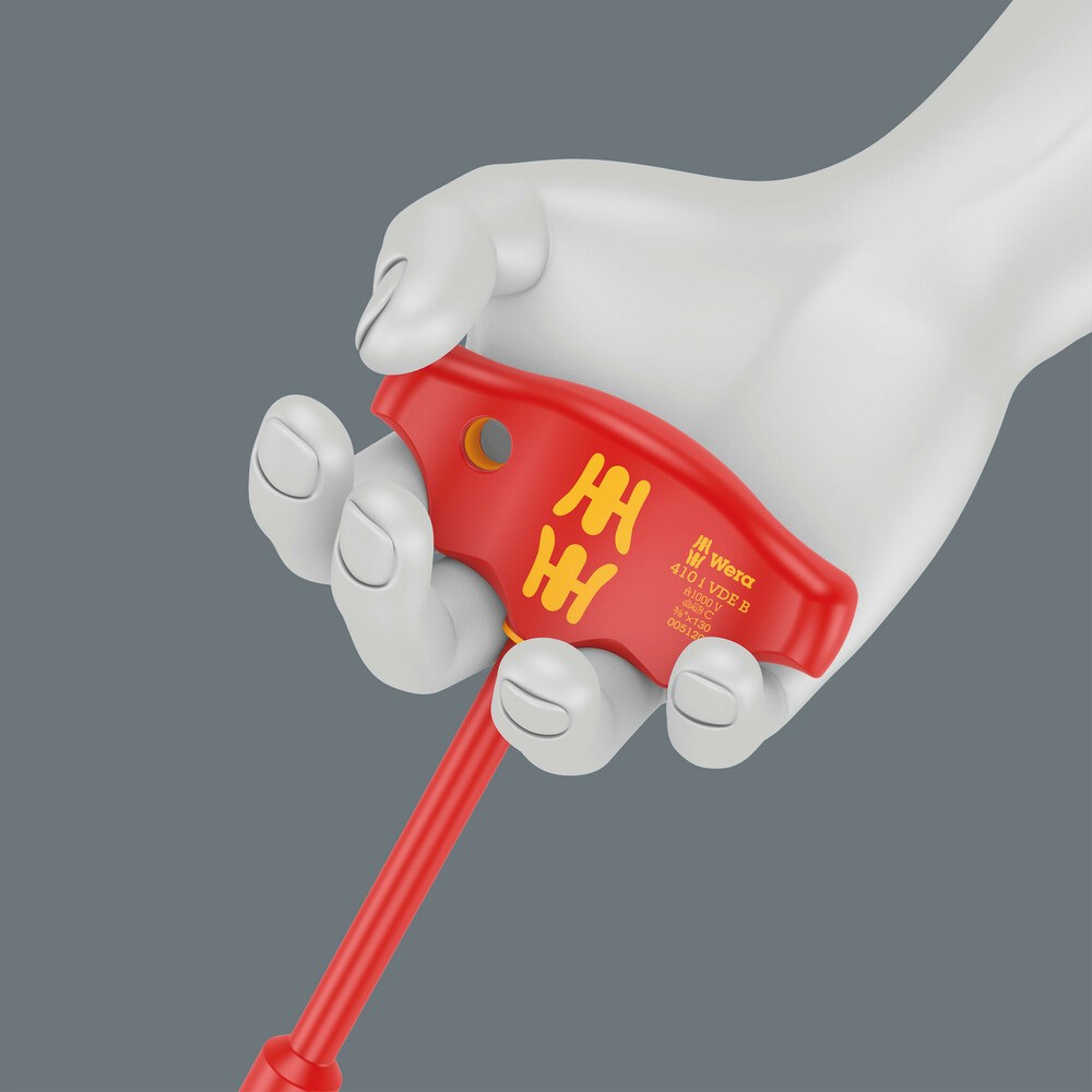 De vorm van de T-greep maakt overdracht van uiterst hoge aanhaal- en losdraaimomenten mogelijk. Dankzij de geometrie van de greep wordt de bal van de hand goed opgevuld en komen de vingers vast in de zacht afgeronde inkepingen in de greep te liggen. Daardoor is een optimale, ergonomische krachtoverdracht gewaarborgd. Individueel getest conform IEC 60900 bij 10.000 V voor veilig werken bij de toegelaten spanning van 1.000 V. Geldt uitsluitend voor 3/8" VDE bit-doppen en doppen uit de Wera Zyklop VDE serie 8740, 8760, 8767 en 8790. De ommantelde handgreep voorkomt tevens dat krasgevoelige oppervlakken beschadigd raken.