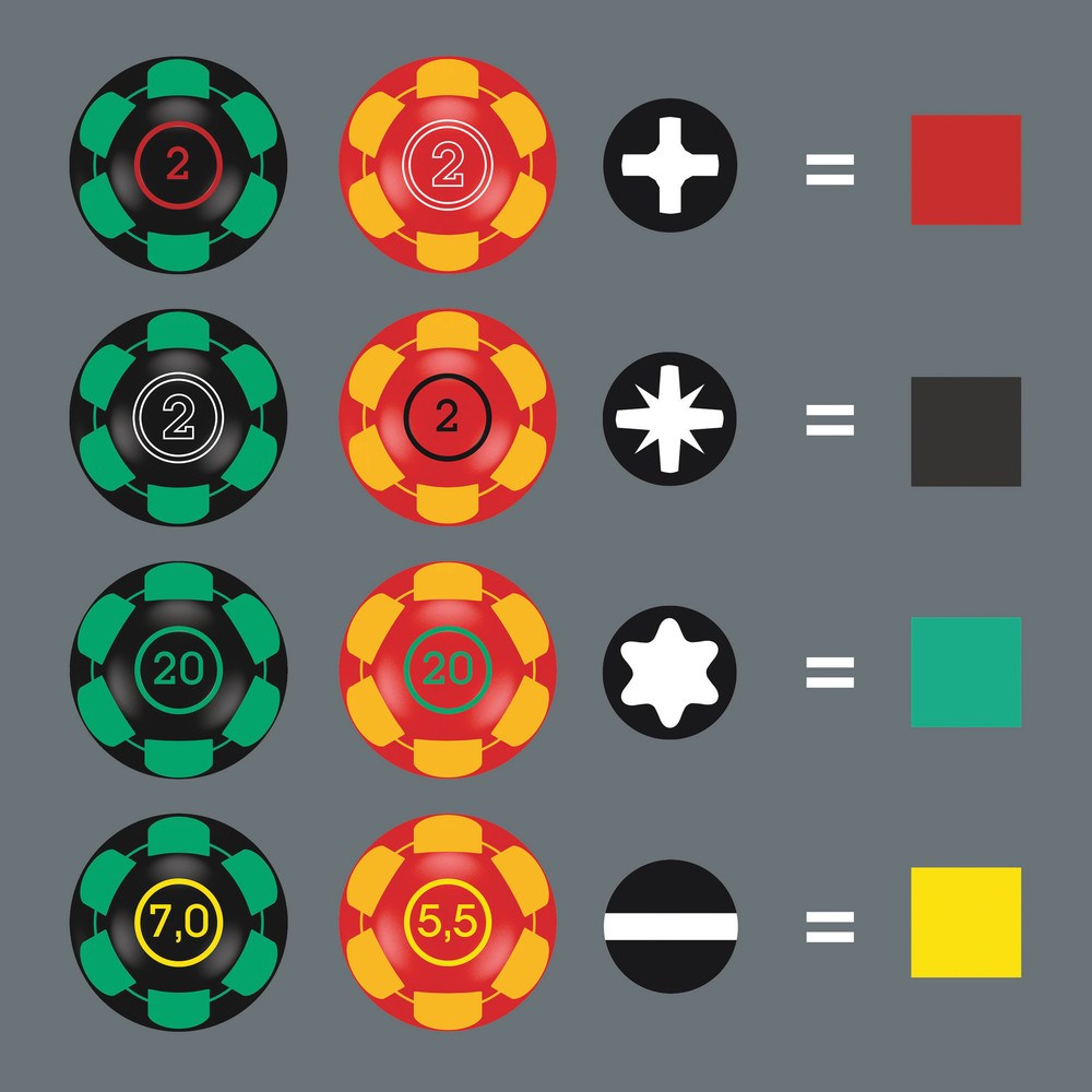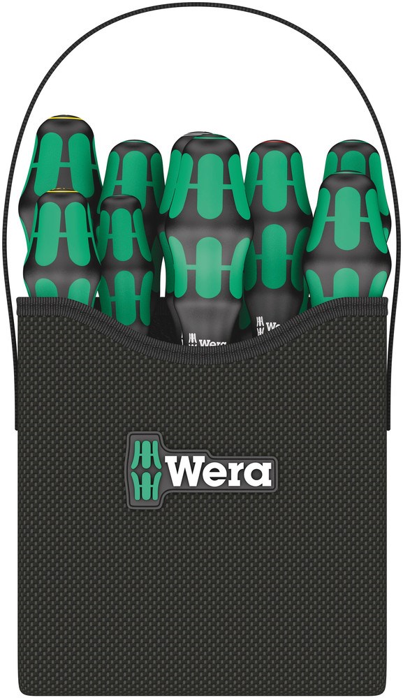 11 Kraftform schroevendraaiers; met Take it Easy Toolfinder; in Wera 2go 4 gereedschapsdraagtas. Met verstelbare vakverdeling om de draagtas aan te passen aan de wensen van de gebruiker.