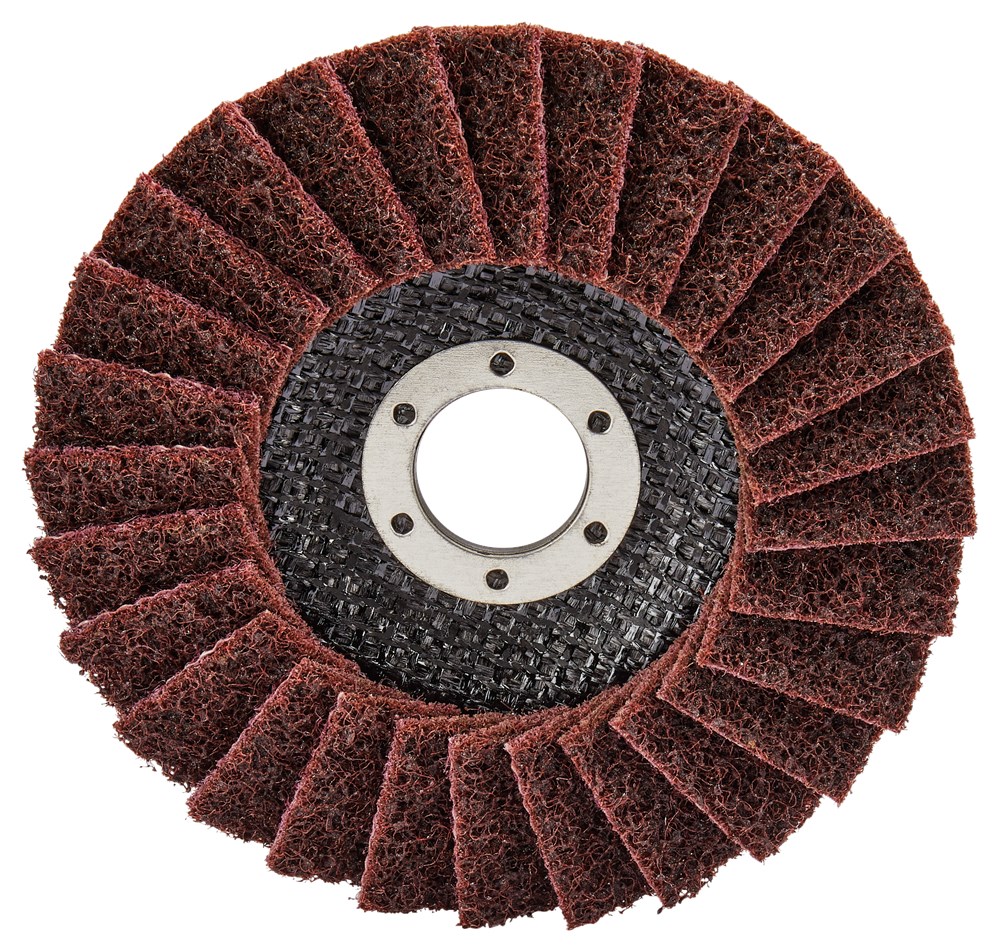 Lamellenschuurvliesschijf schuin voor oppervlaktebehandeling 125mm. Korrel: medium. Geschikt voor het (op)poetsen van materialen na het slijpen zoals het verwijderen van lasverkleuringen. Geschikt voor metaal en RVS.